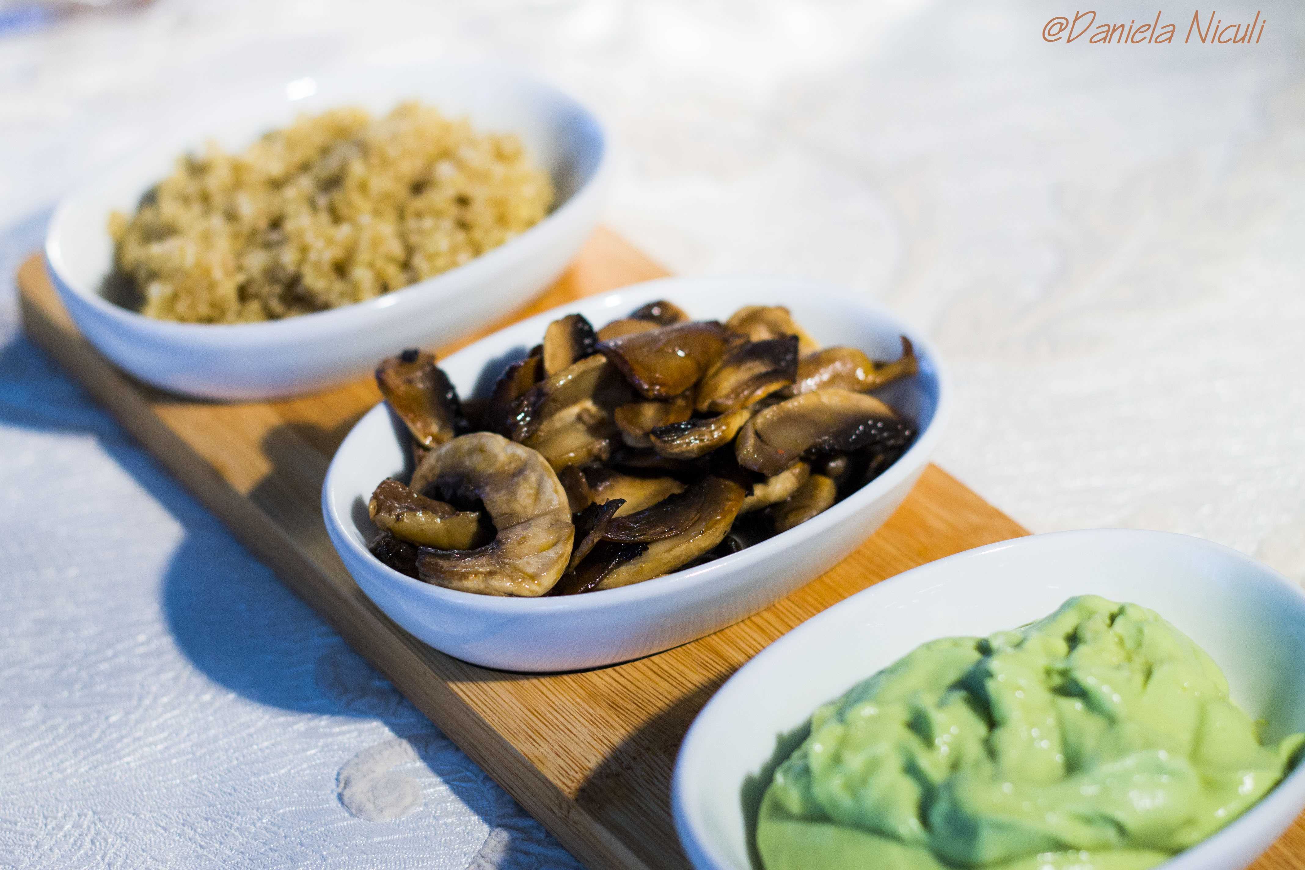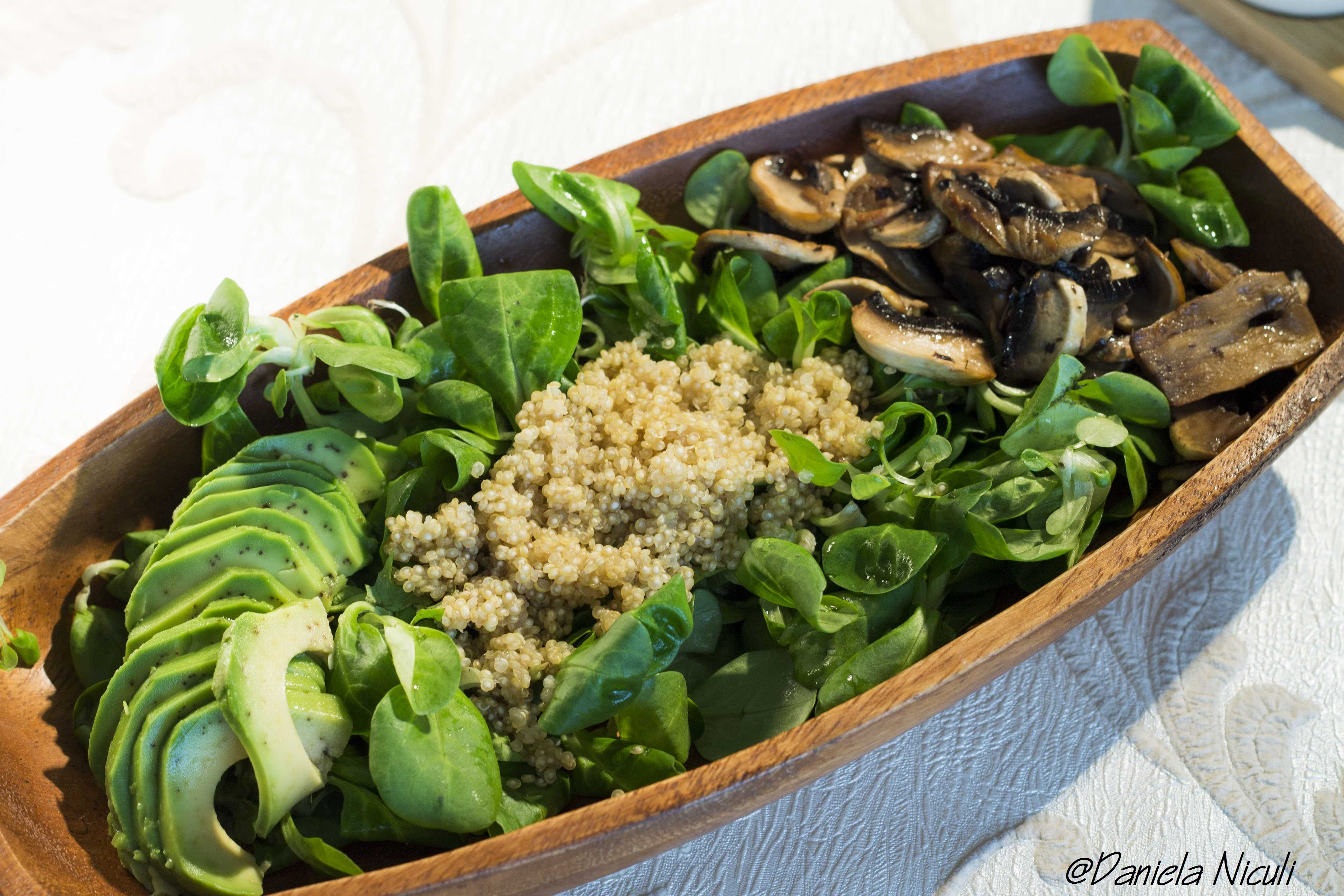 Mai intai asezam in bol frunzele de valeriana, ce au fost lasate pe un prosop pentru a elimina apa. Dupa care adaugam quinoa, ciupercile si avocado, iar sosul se adauga dupa preferintele fiecaruia.