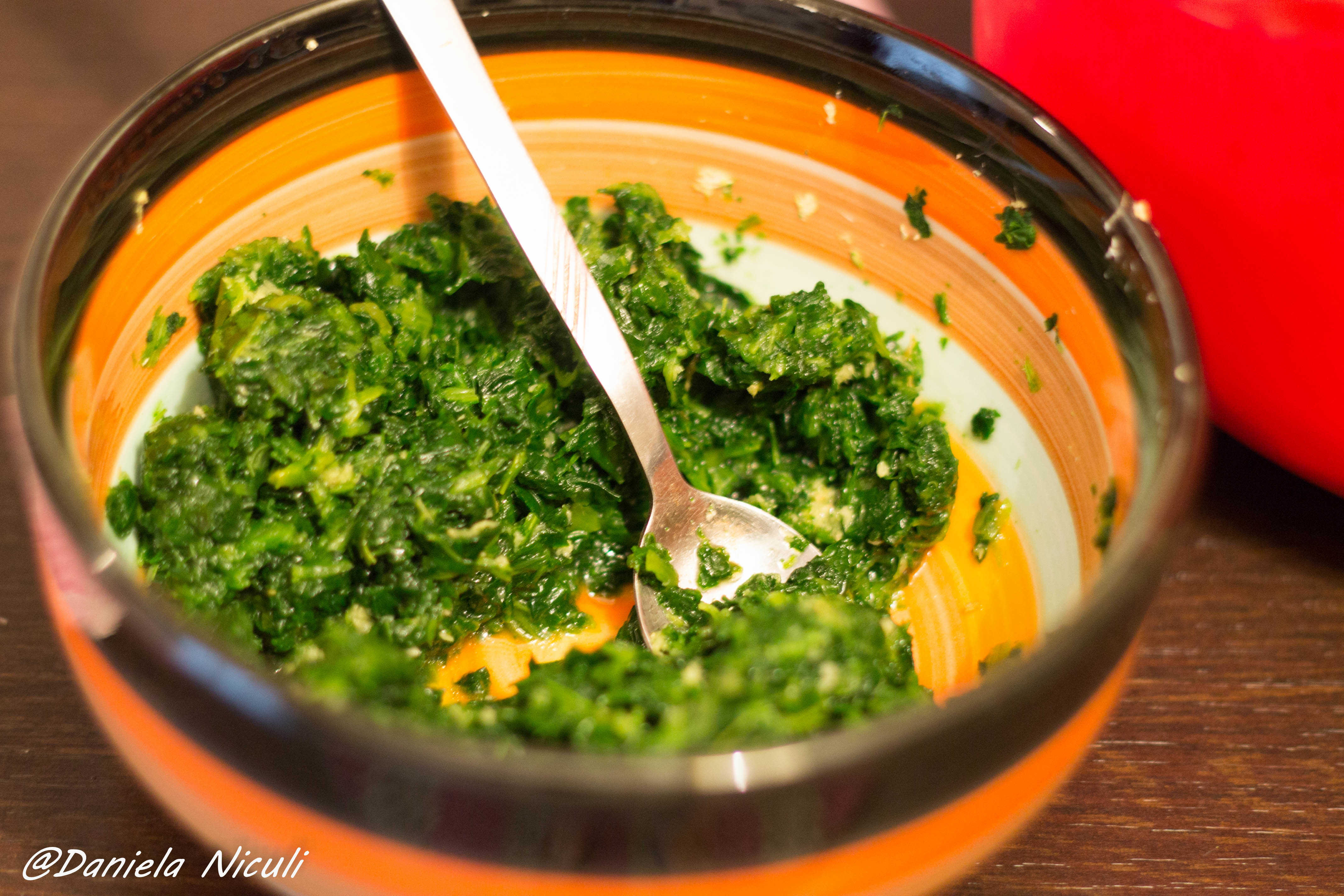 Pentru inceput se decongeleaza spanacul si se scurge bine de excesul de apa.