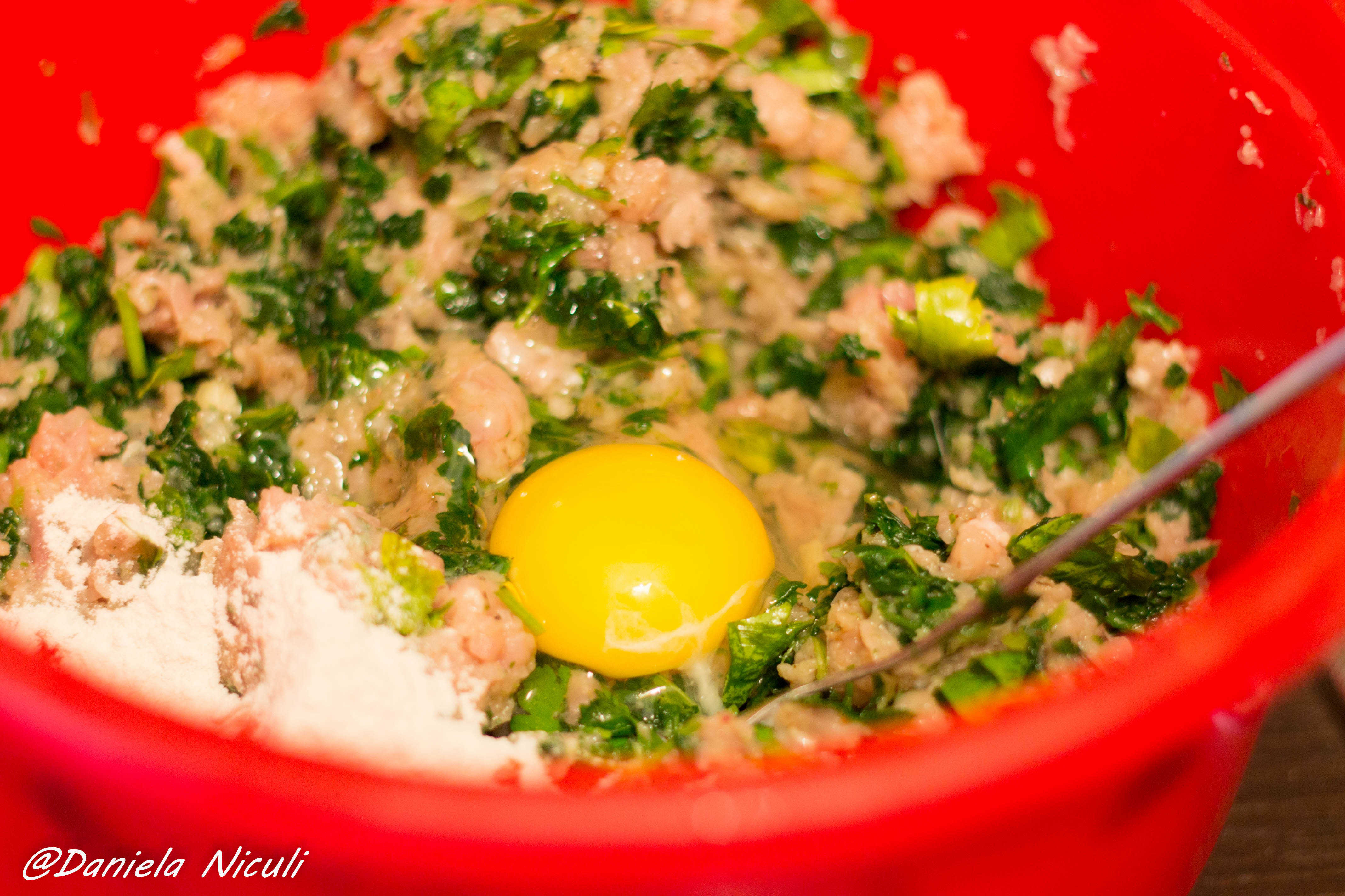 Se amesteca carnea tocata cu oul, faina, patrunjelul, usturoiul, spanacul scurs bine, sare si piper.