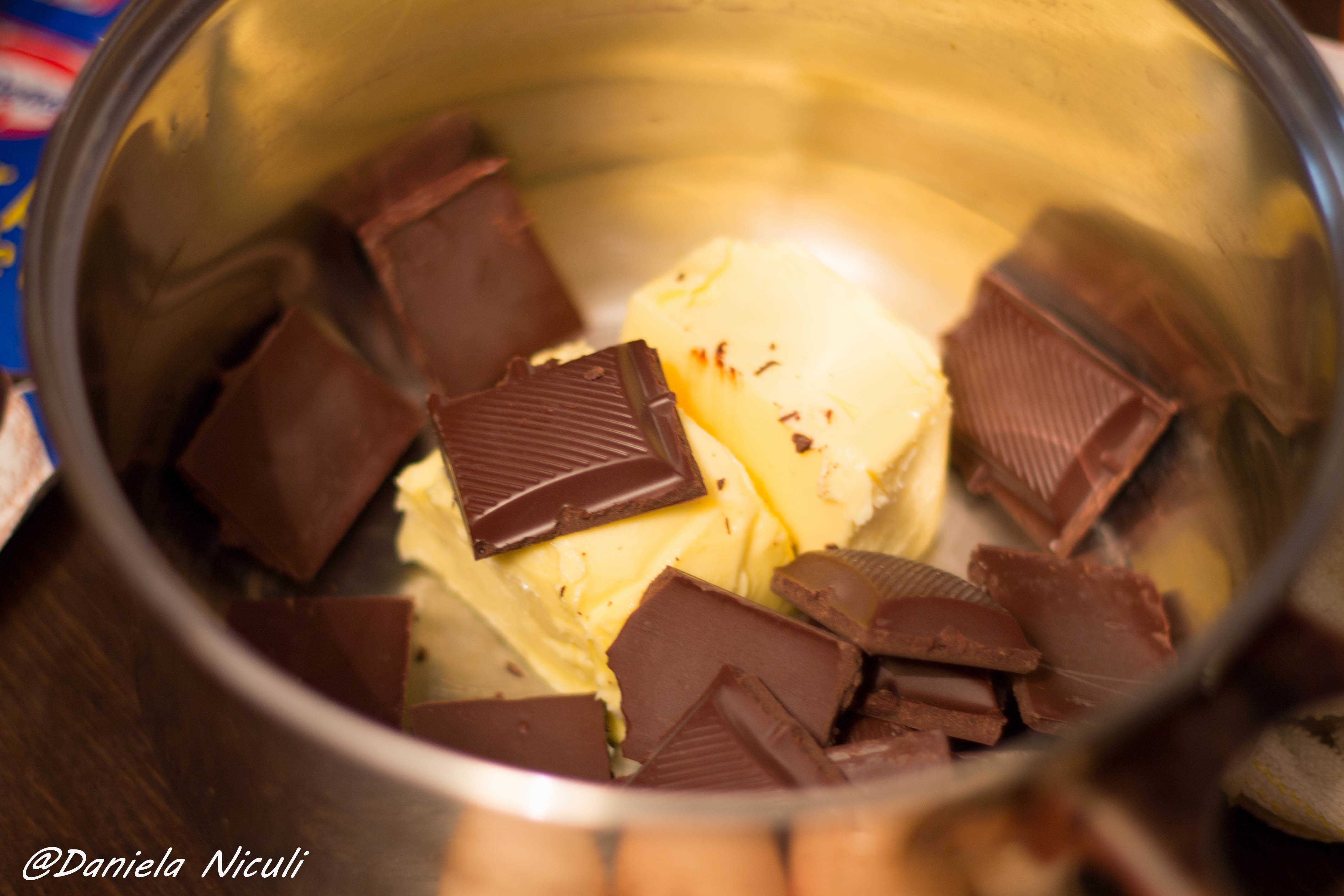 Untul ( 80 grame) impreuna cu ciocolata se topesc pe baie de aburi si se amesteca pana cand se omogenizeaza.
