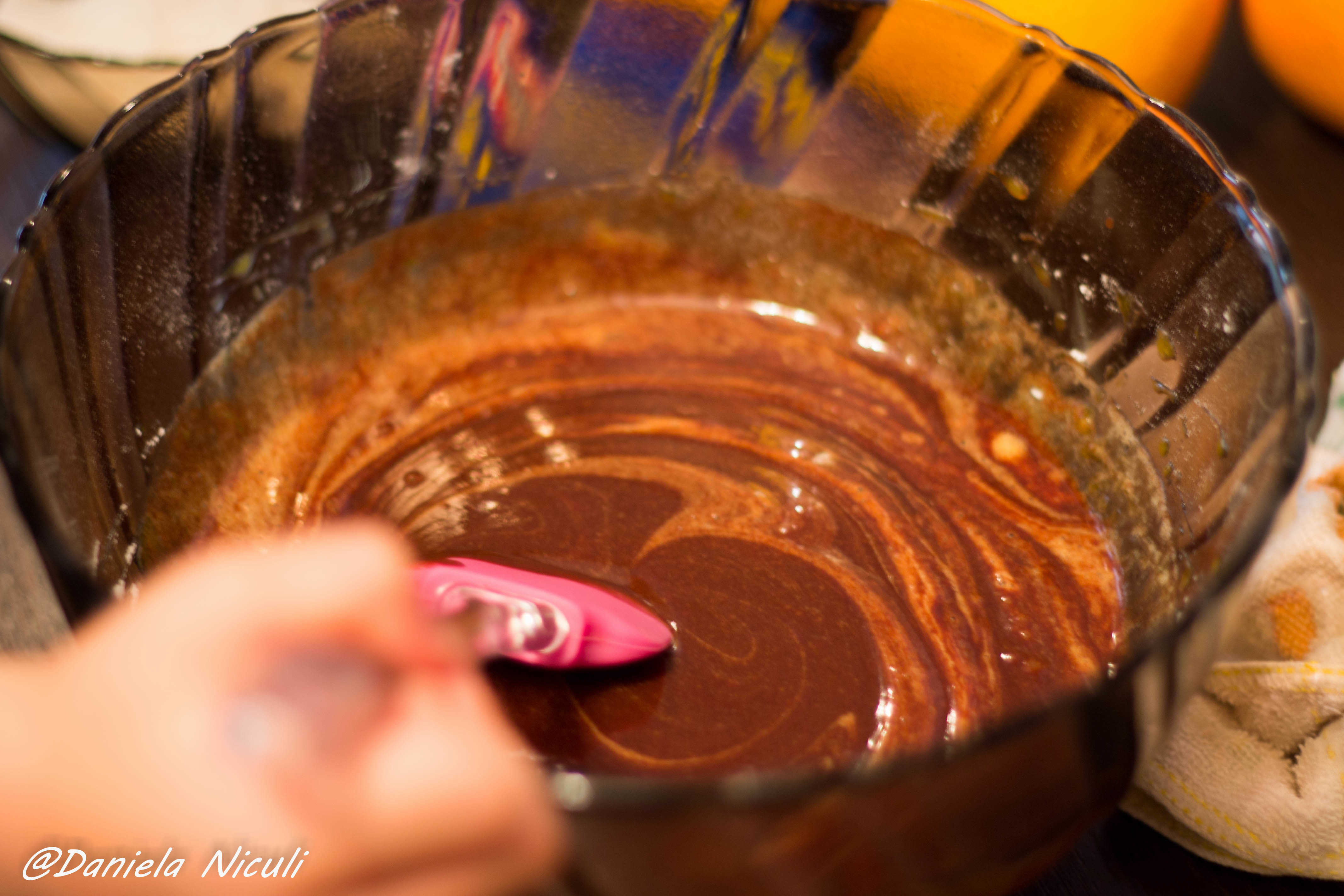 Se amesteca cele doua compozitii, ciocolata topita impreuna cu ouale mixate, la care se adauga faina cernuta.