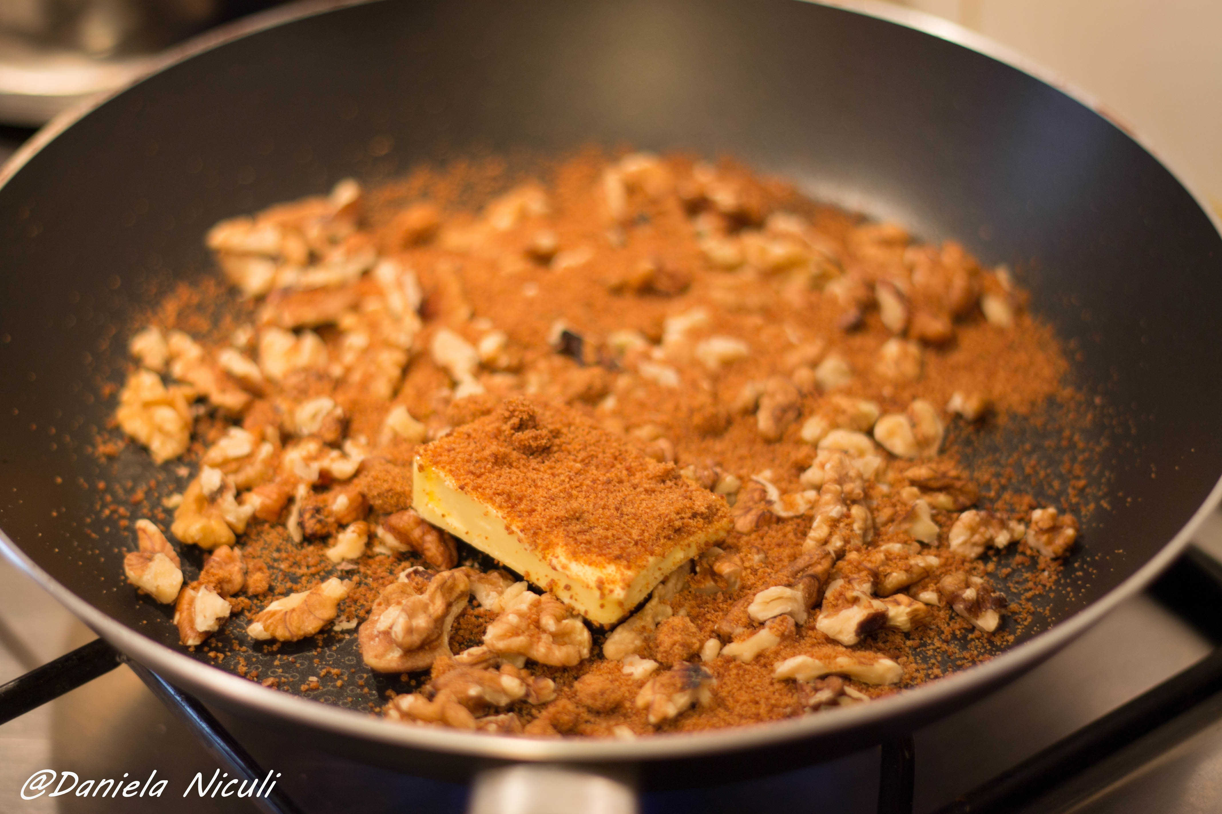 Nucile le-am tras la tigaie impreuna cu untul, scortisoara si cele 3 linguri de zahar de cocos ( acesta este singurul care il am in casa, puteti folosi orice alta varianta).
