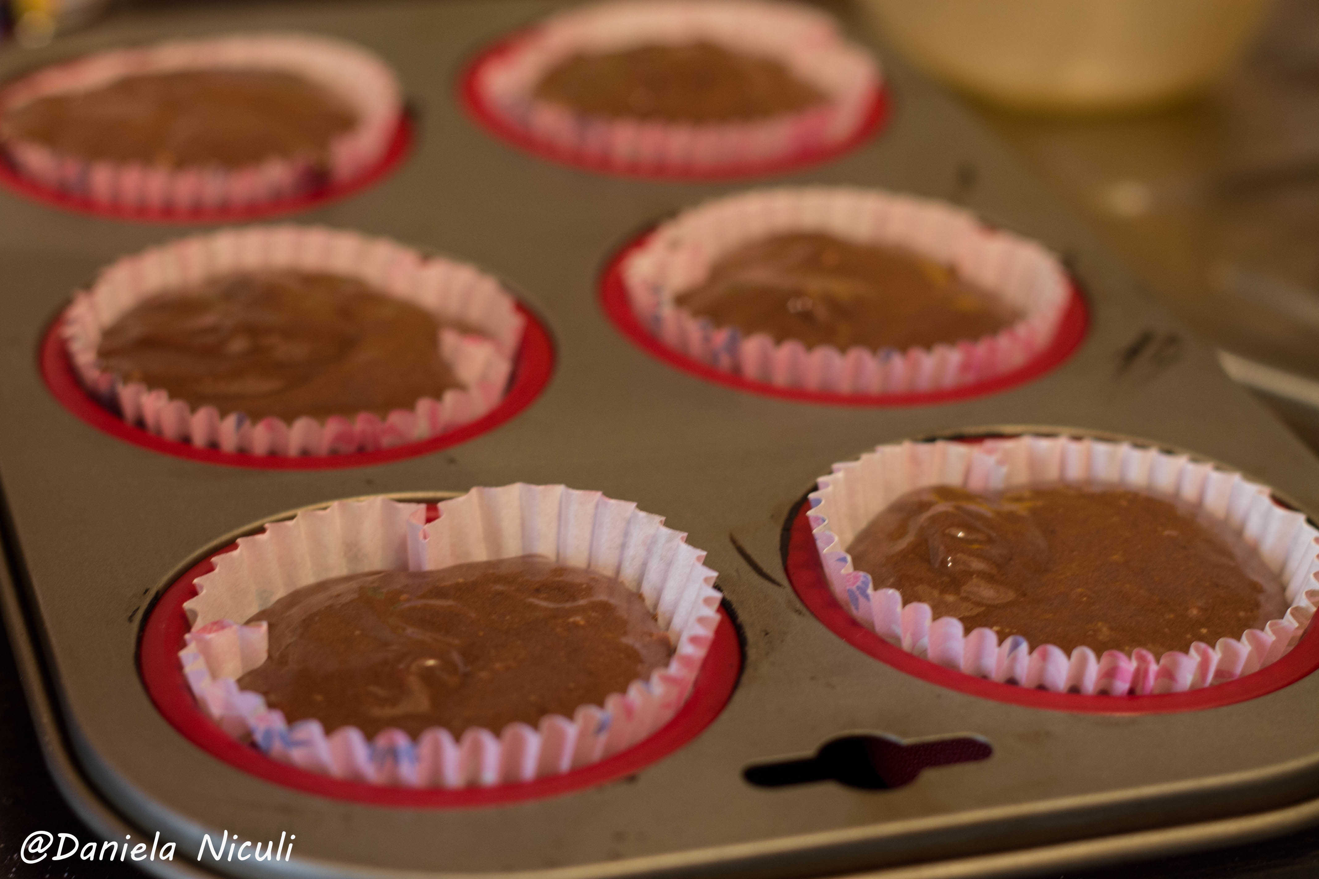 Din compozitia rezultata umplem forme de briose. Eu aleg sa adaug o contitate mai mare pentru ca briosele sa aibe impact si sa fie voluminioase. Asa ca eu torn compozitie chiar pana sus, la marginea formelor folosite.