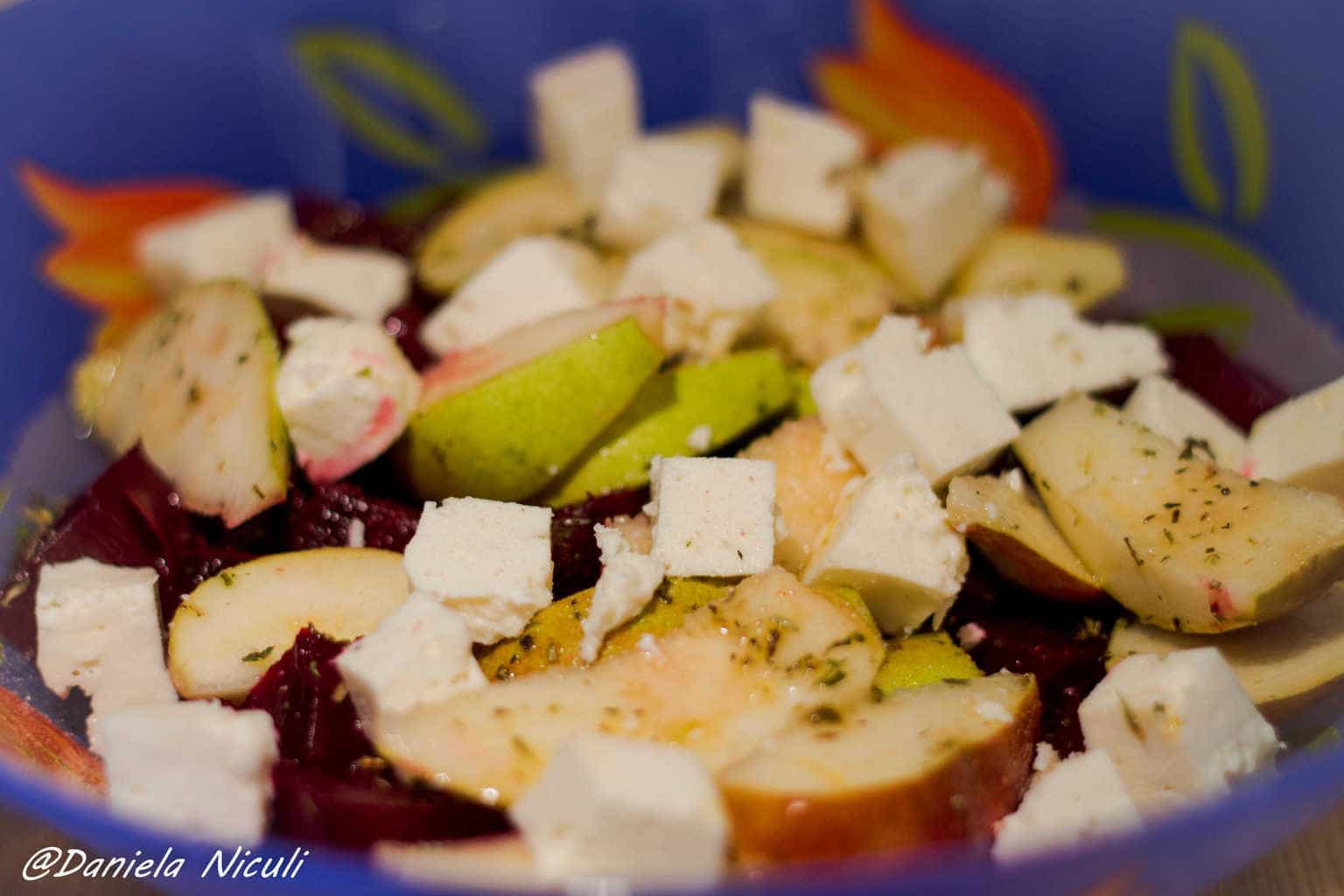 Modalitate de preparare salata de sfecla rosie cu pere si branza de capra: