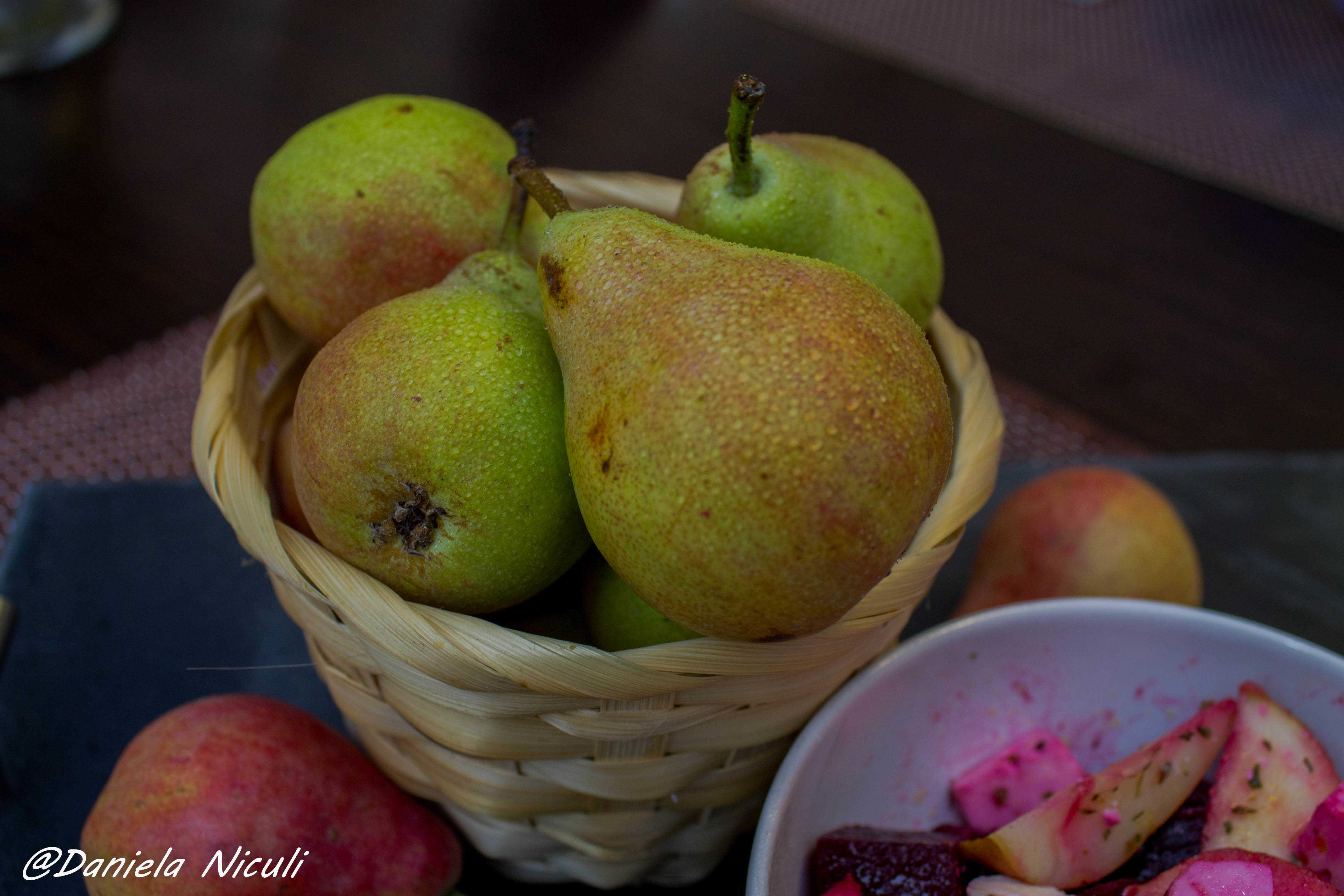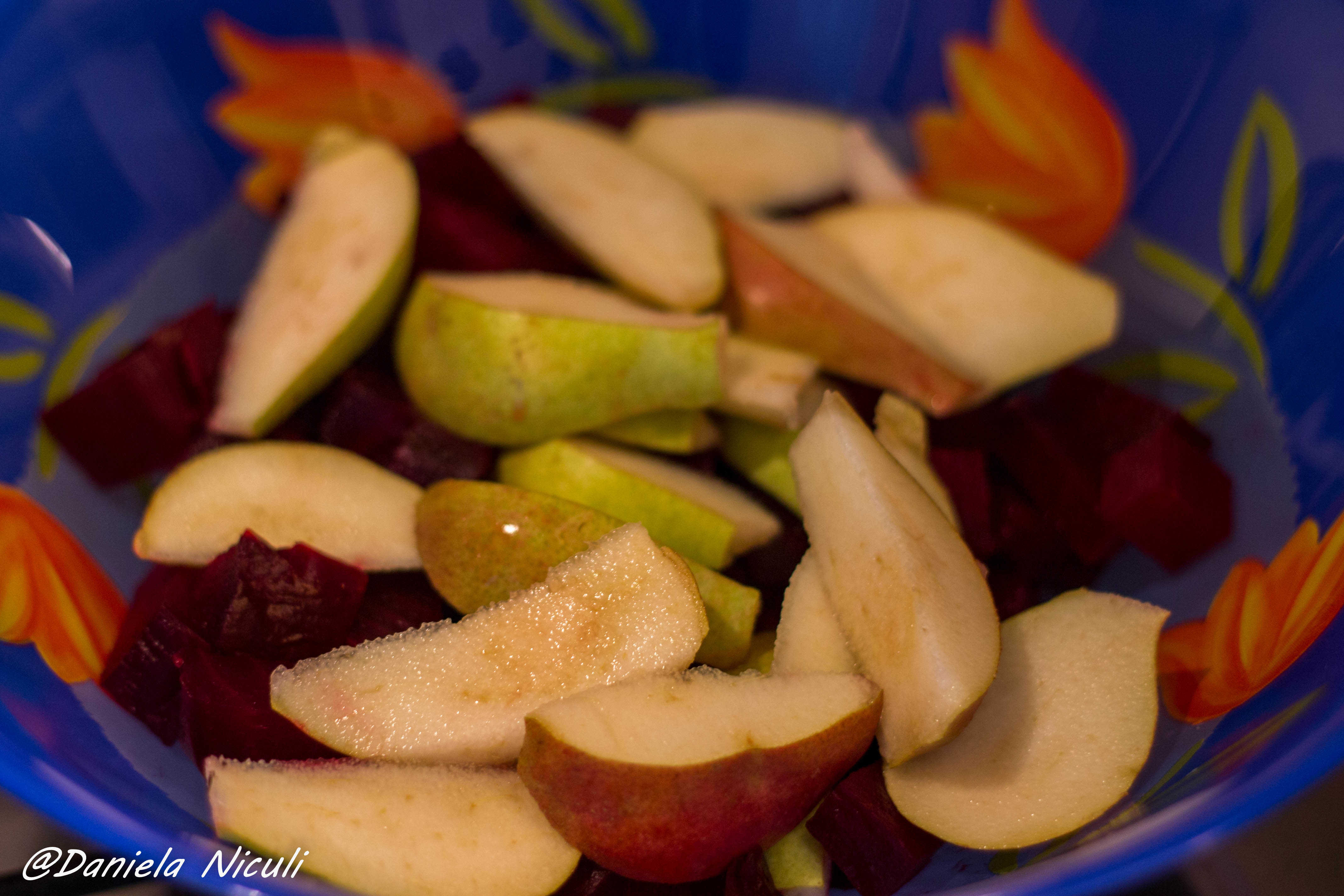 Am feliat sfecla si apoi am taiat-o in cuburi, iar perele le-am taiat in felii.