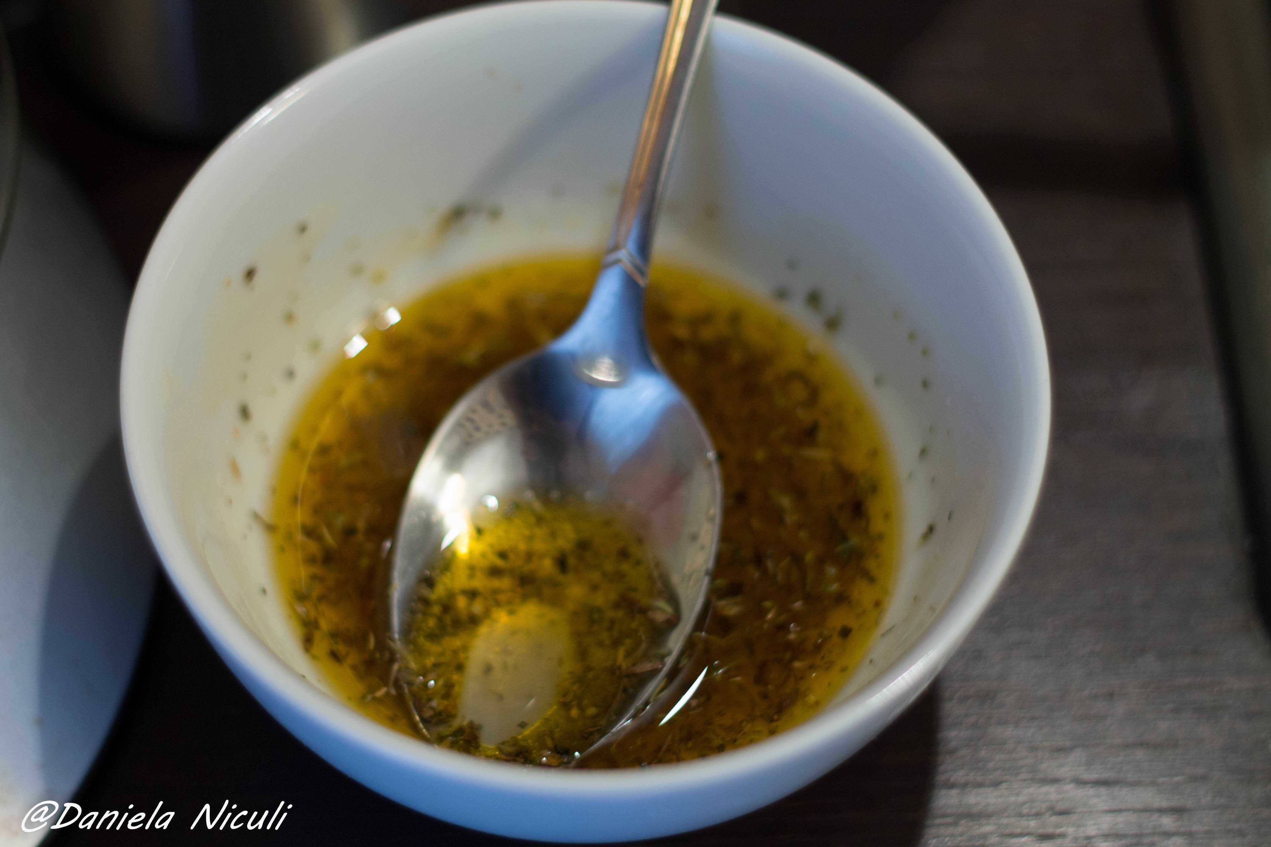 Intr-un castron am amestecat 2 linguri cu ulei de masline si aroma de portocala, sucul de la jumatate de lamaie, jumatate de lingurita cu oregano, sare dupa gust si 1 lingurita cu otet din vin.