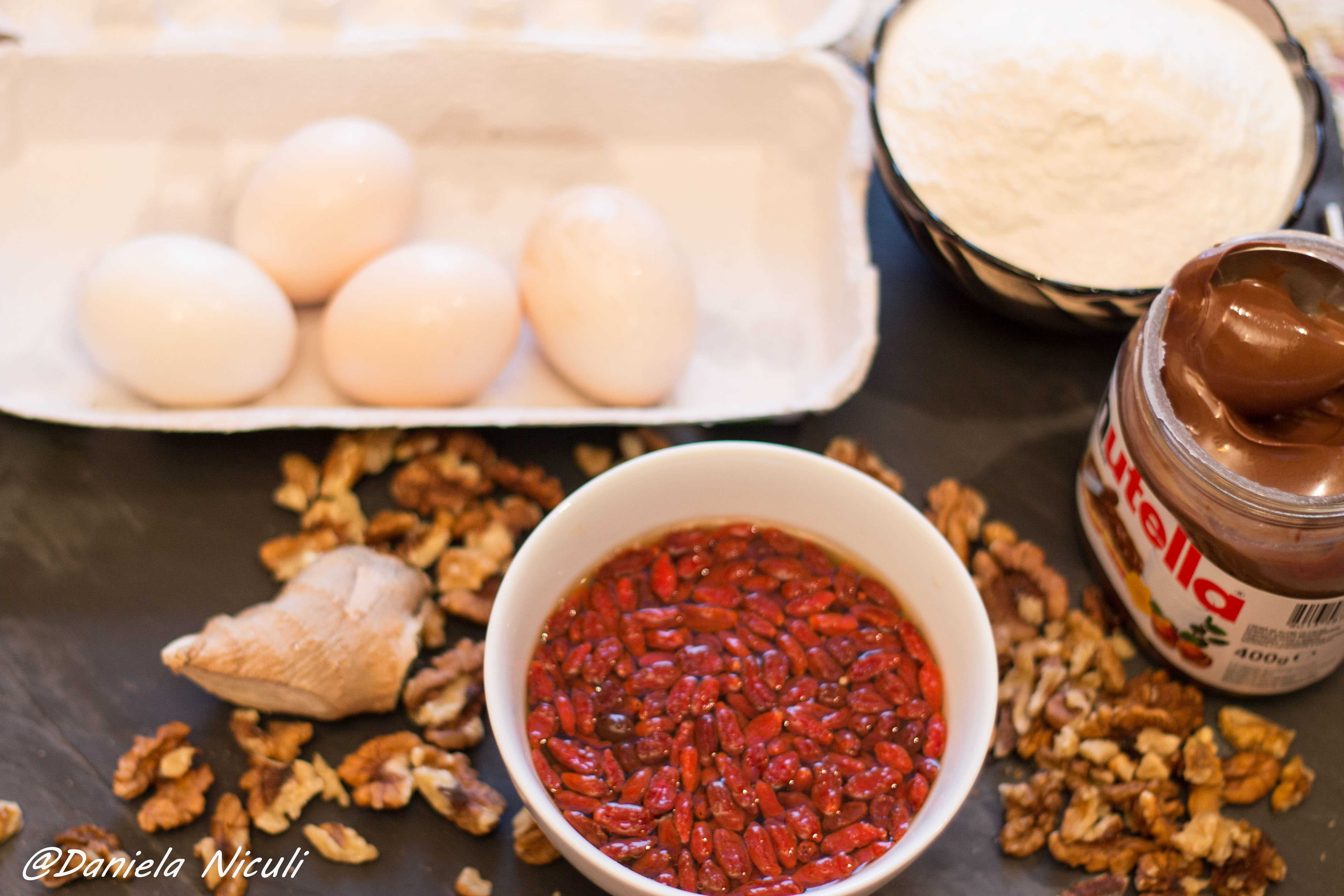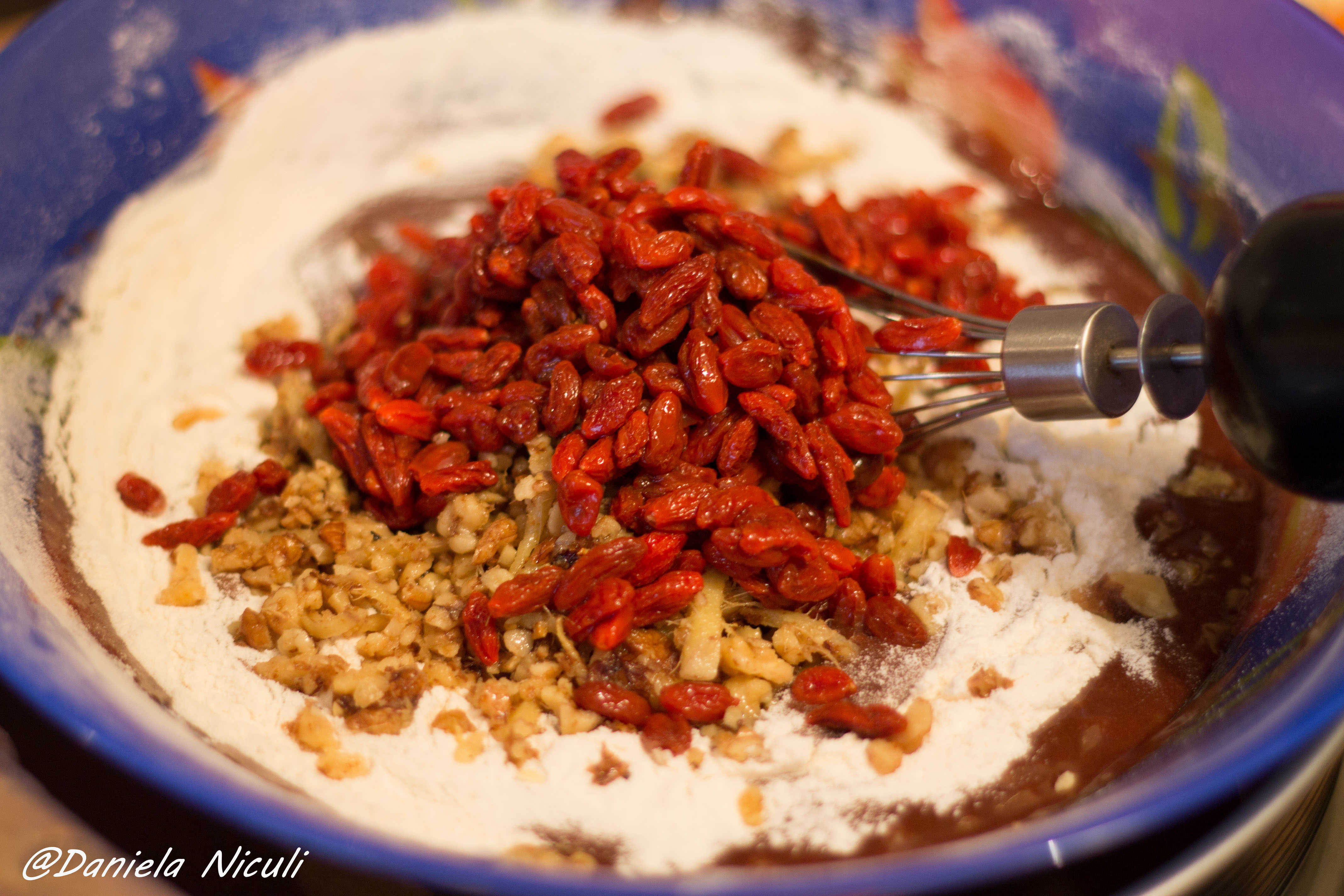 Pasul 7. Acum a sosit momentul sa adaugam faina cernuta impreuna cu praful de copt, amestecul de ghimbir cu nuci si fructele goji scurse de excesul de apa.