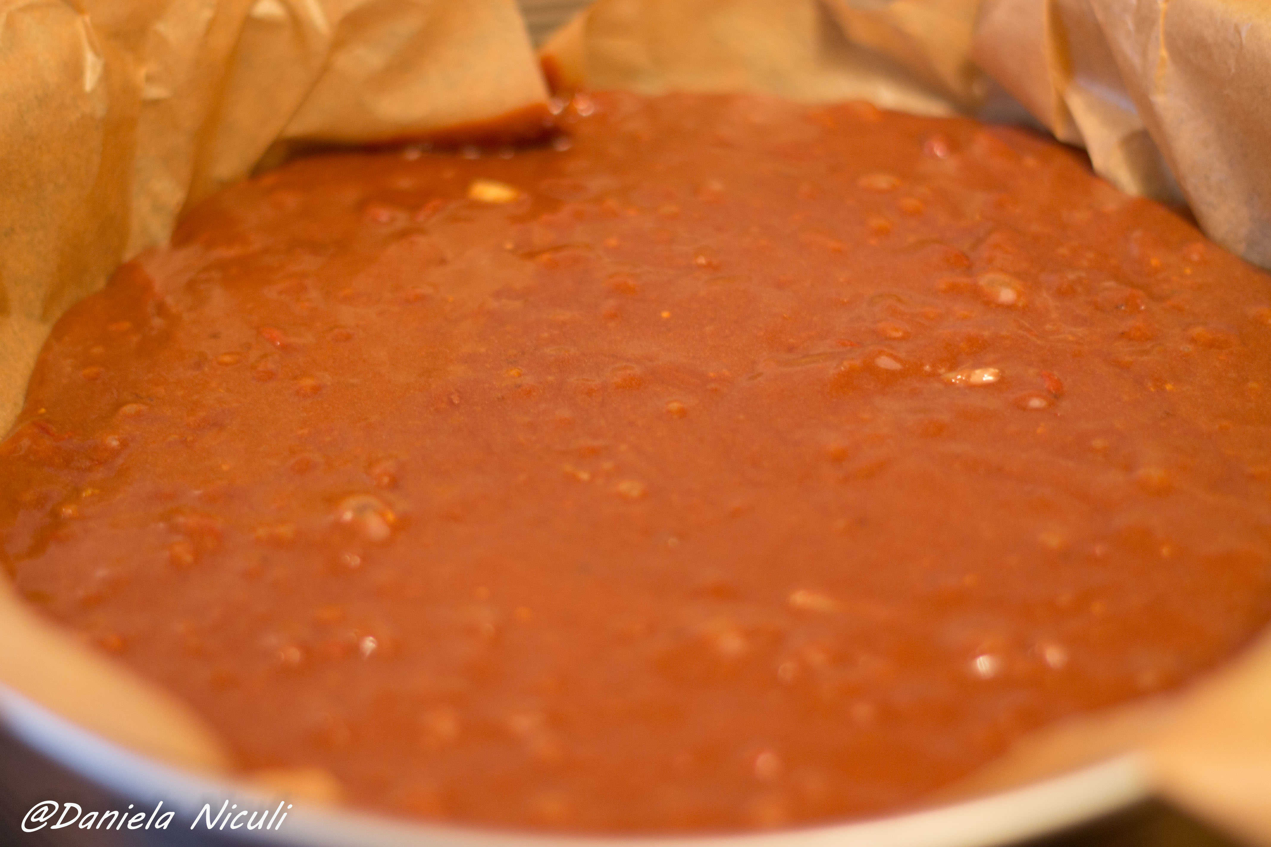 Pasul 8. Amestecam in continuare pana la omogenizare, iar compozitia obtinuta o turnam intr-o tava cu diametrul de 25 cm tapetata cu hartie de copt.