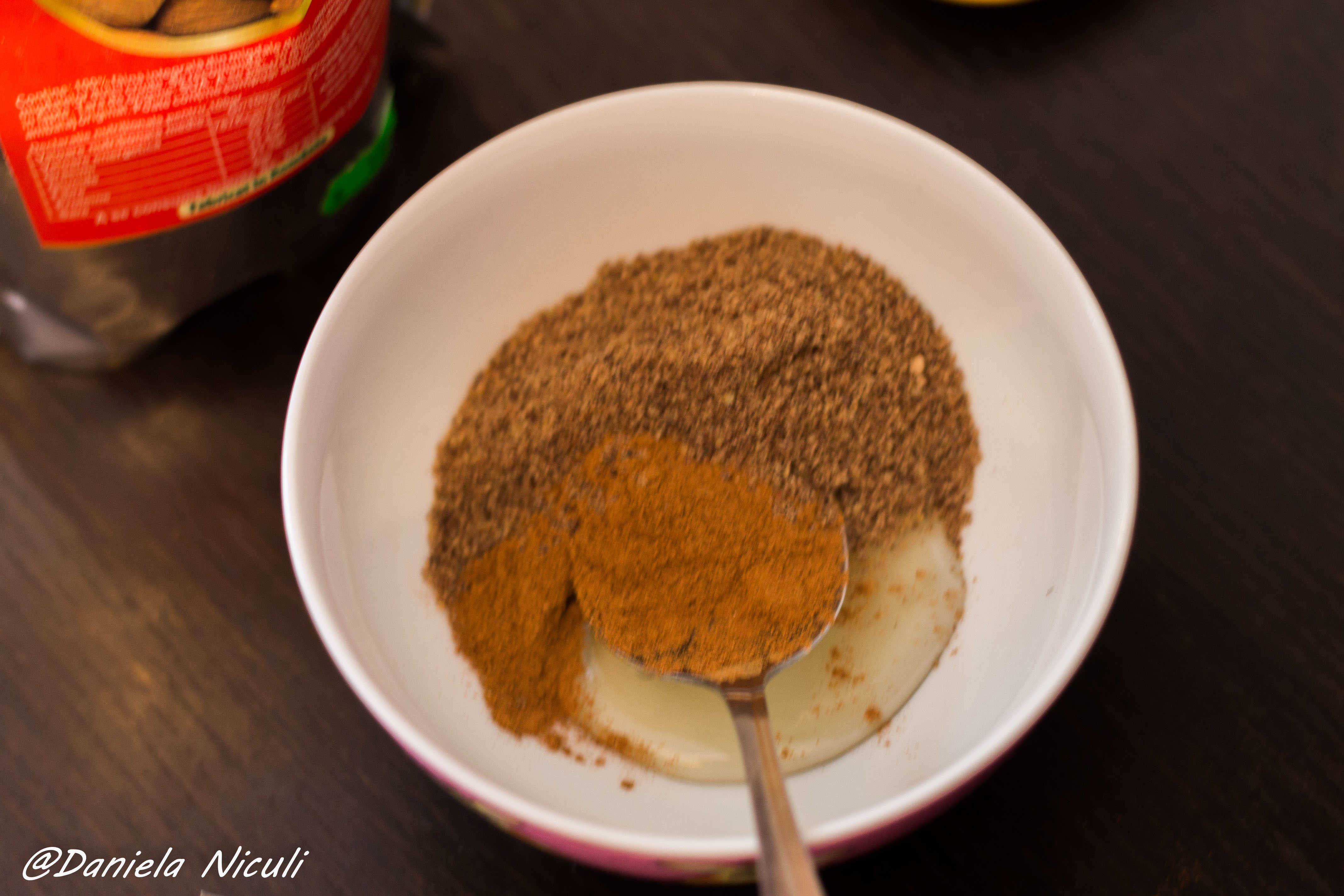 Punem prunele intr-un vas termorezistent, iar intr-un bol separat, amestecam mierea de albine, sucul de lamaie, faina de migdale si scortisoara.
