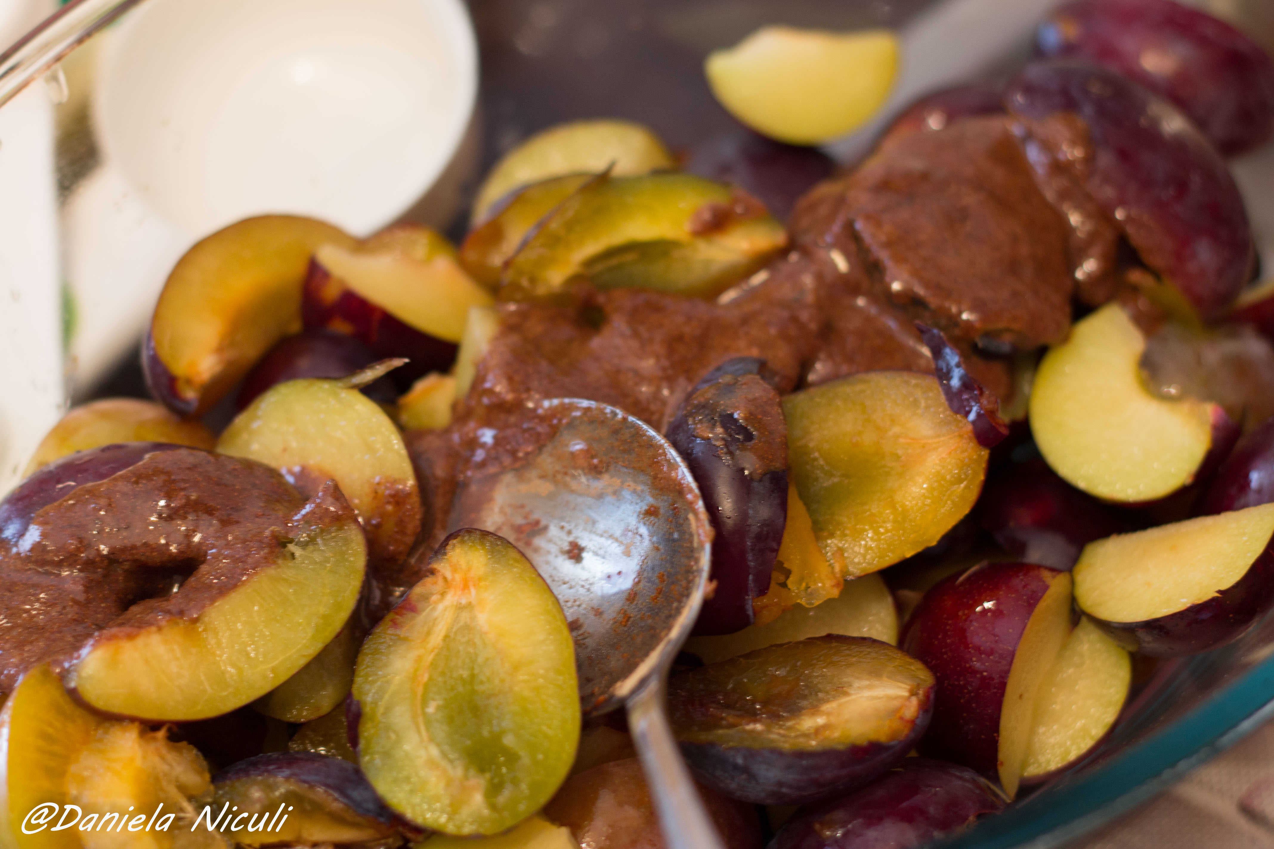 Amestecul obtinut il turnam peste prune si le amestecam pentru a distribui pe toate fructele din vas.