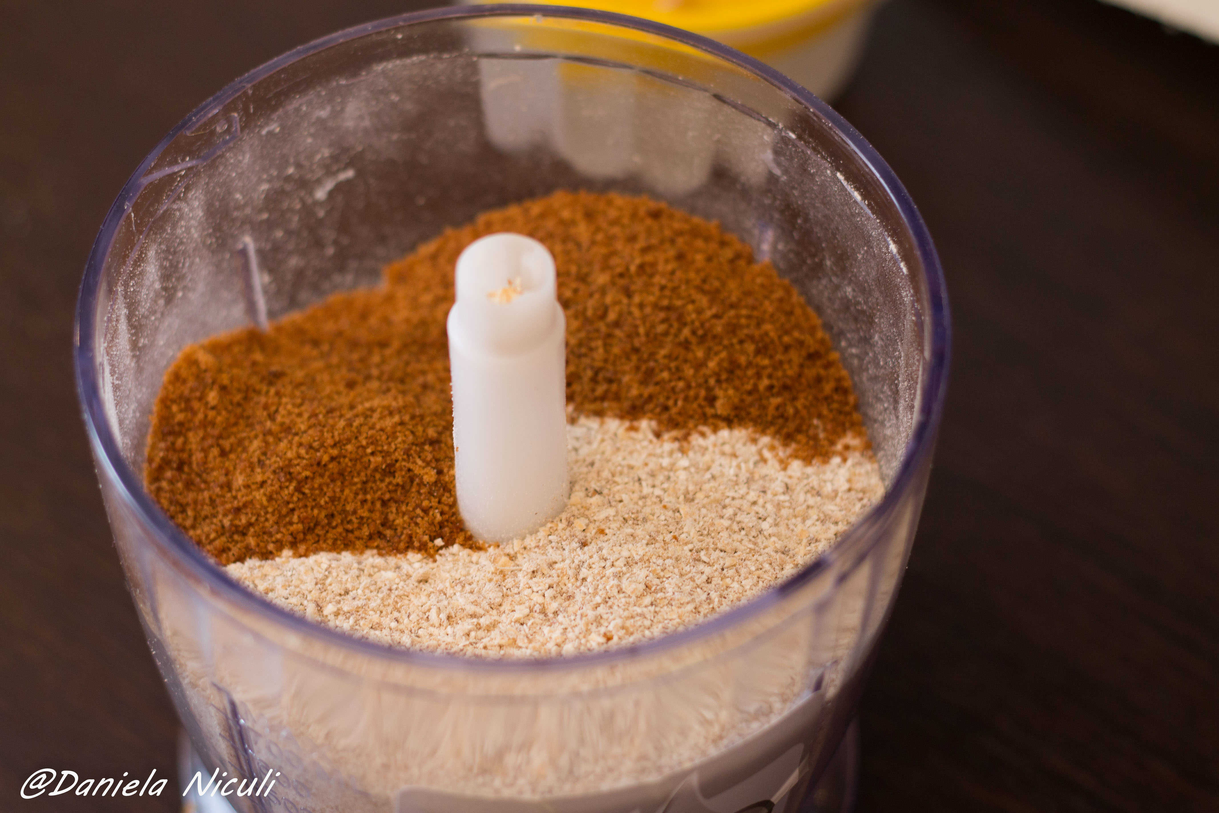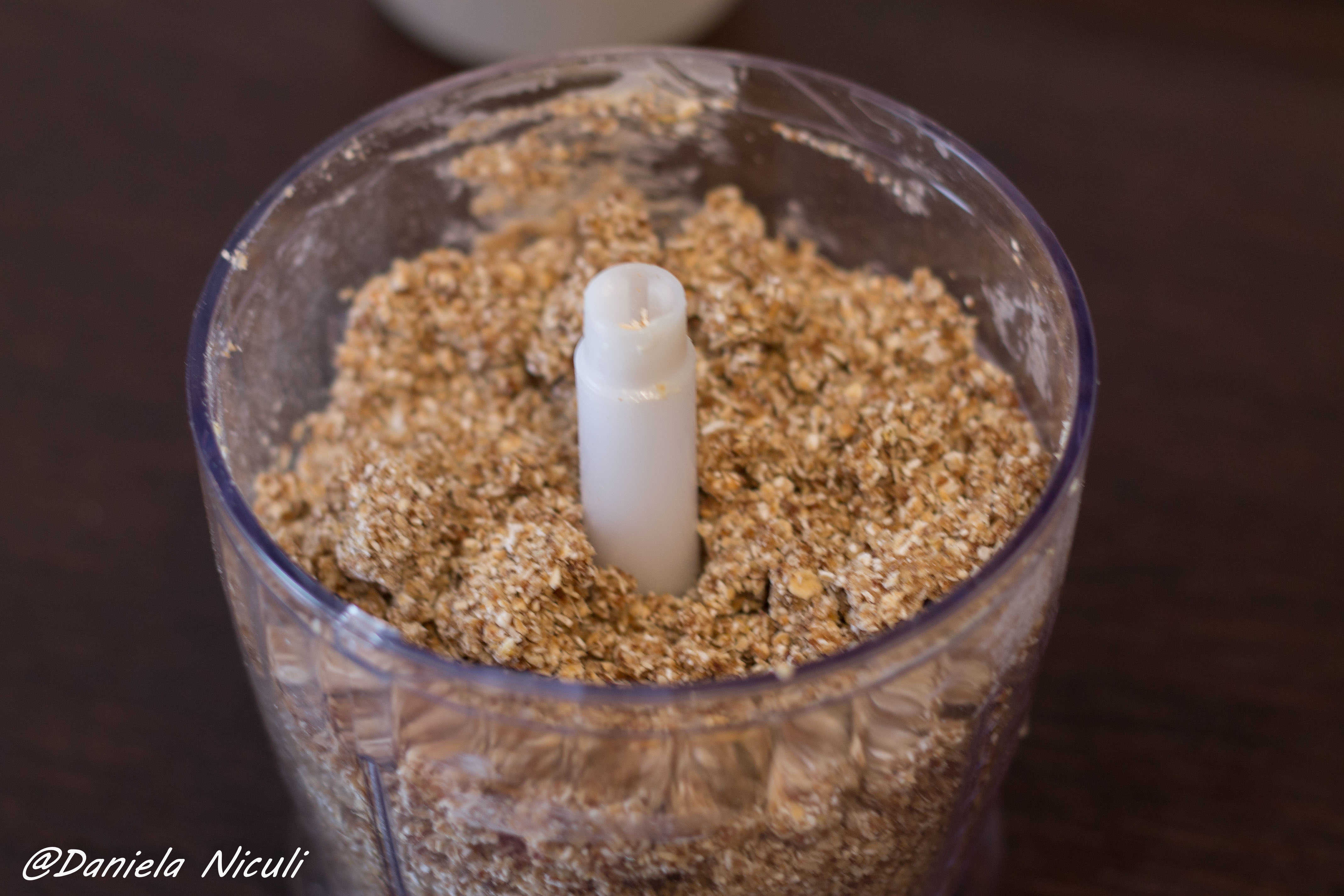 Fulgii de ovaz i-am maruntit cu ajutorul unui tocator electric, un electrocasnic minunat pentru aceasta operatiune. Pulsati pana ajungeti la textura taratelor de ovaz , apoi adaugati zaharul.