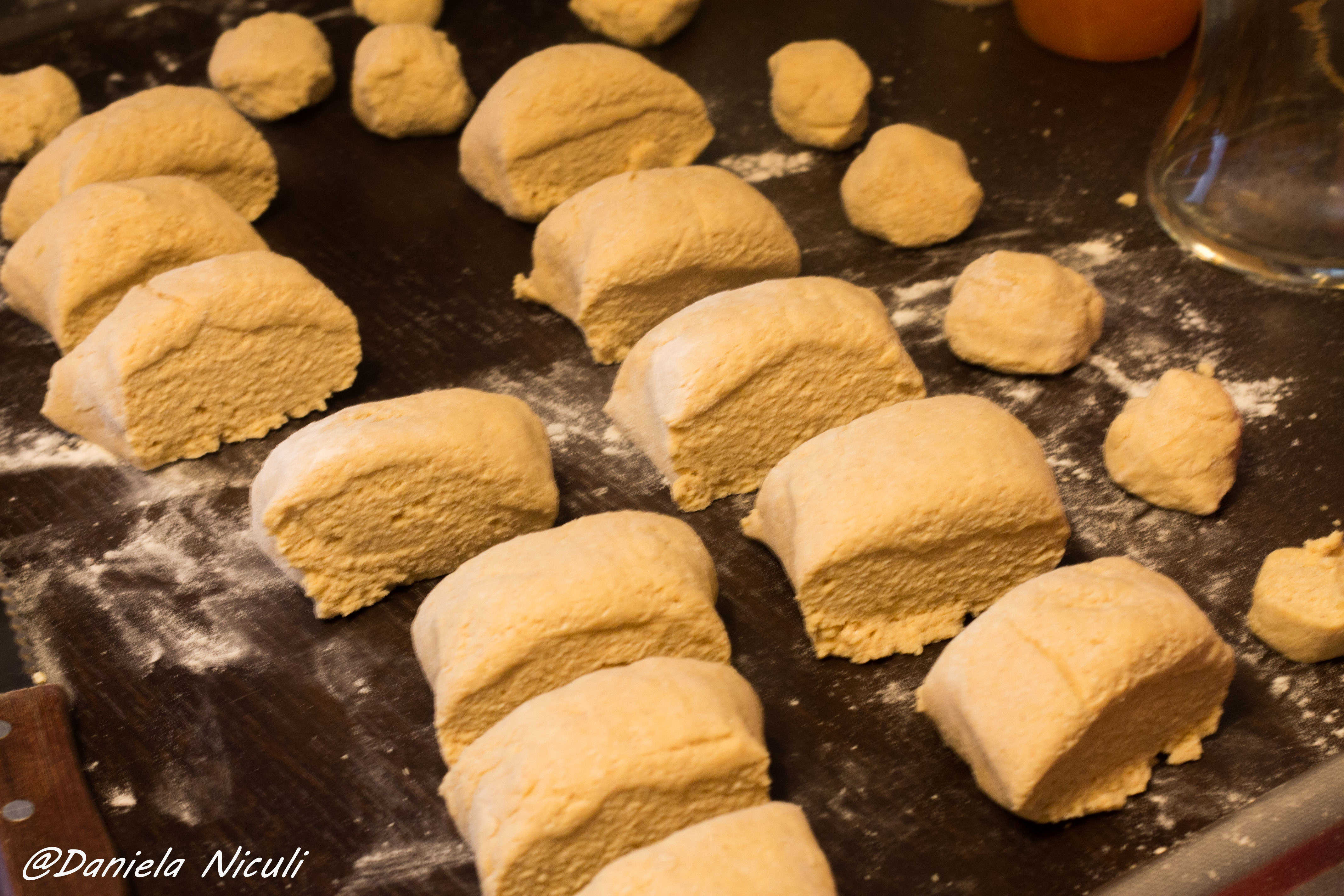 Luati fiecare bucata si modelati-o cu ajutorul mainilor, aplatizati usor bucatile de aluat pentru a le da o forma rotunda.
