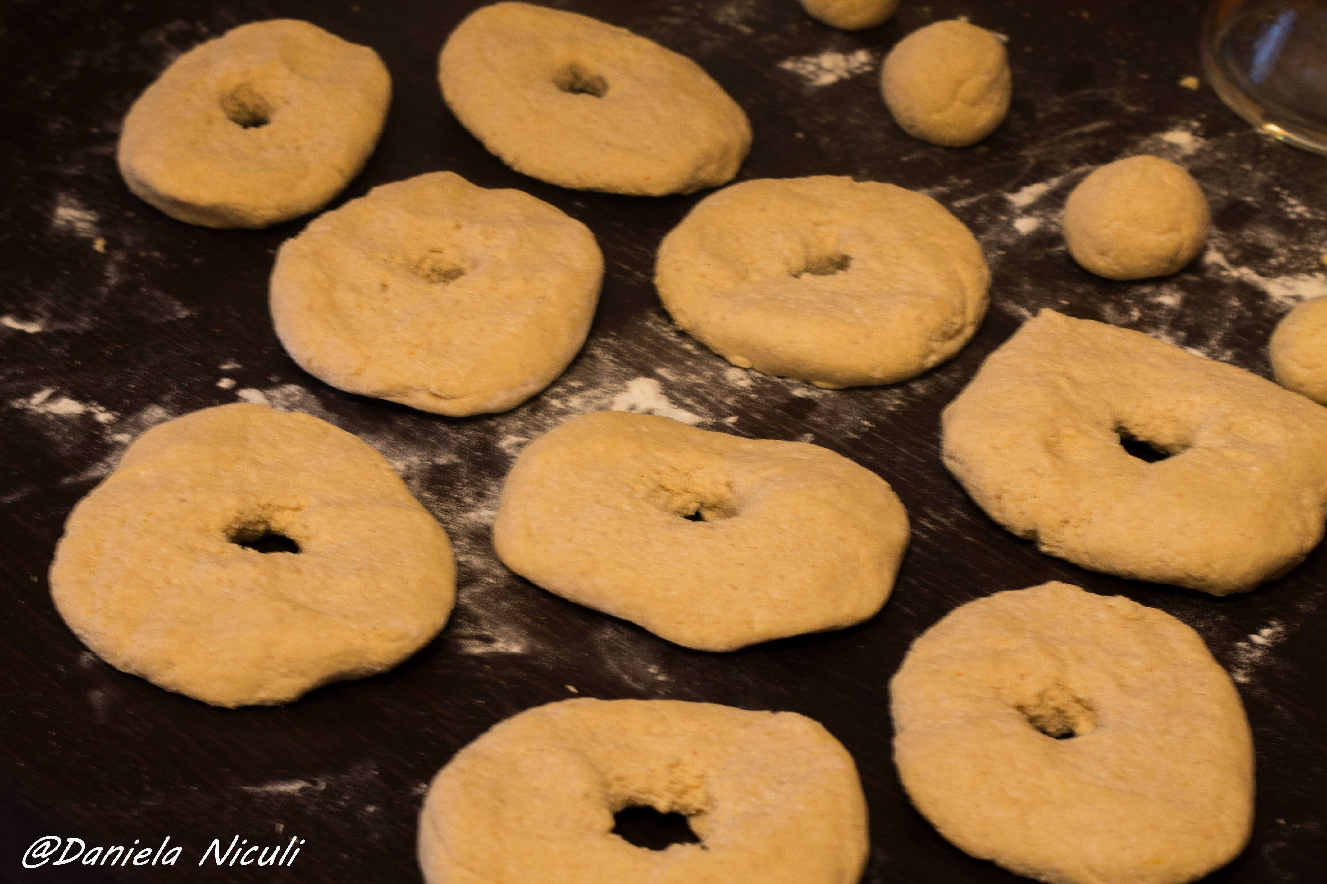 Puneti forma obtinuta pe blatul de lucru si cu degetul gauriti centrul acesteia, rotiti degetul pentru a avea un orificiu central si continuati procedura cu fiecare bucata mare.