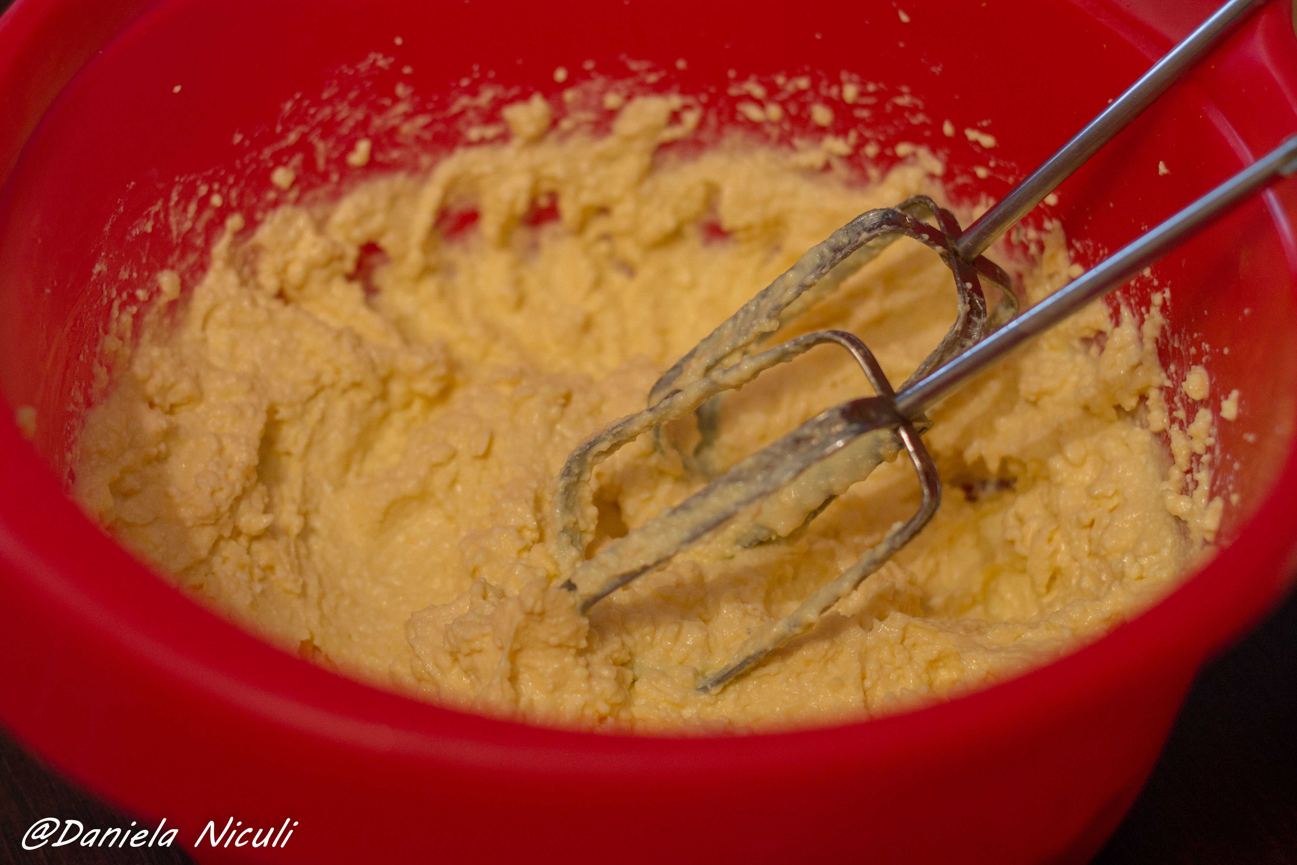 Cu un mixer amestecati ingredientele bine, puteti folosi si o lingura sau o furculita, insa amestecand cu un mixer veti reusi sa omogenizati ingredintele mult mai bine ceea ce este esential la aceasta reteta.