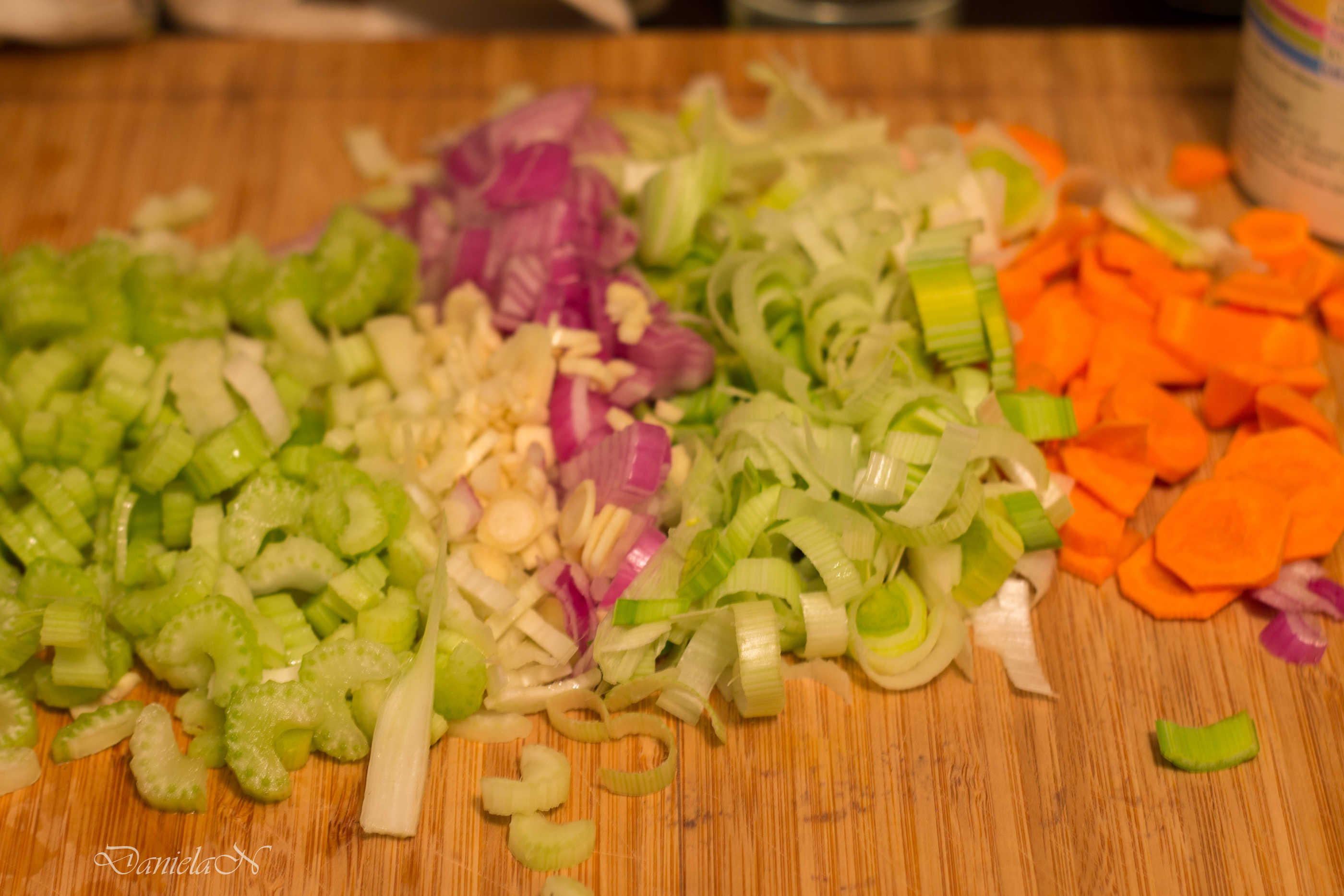 Tocam usturoiul, ceapa, prazul, apio. Taiem morcovul in rondele sau in cuburi, cum va este mai usor.