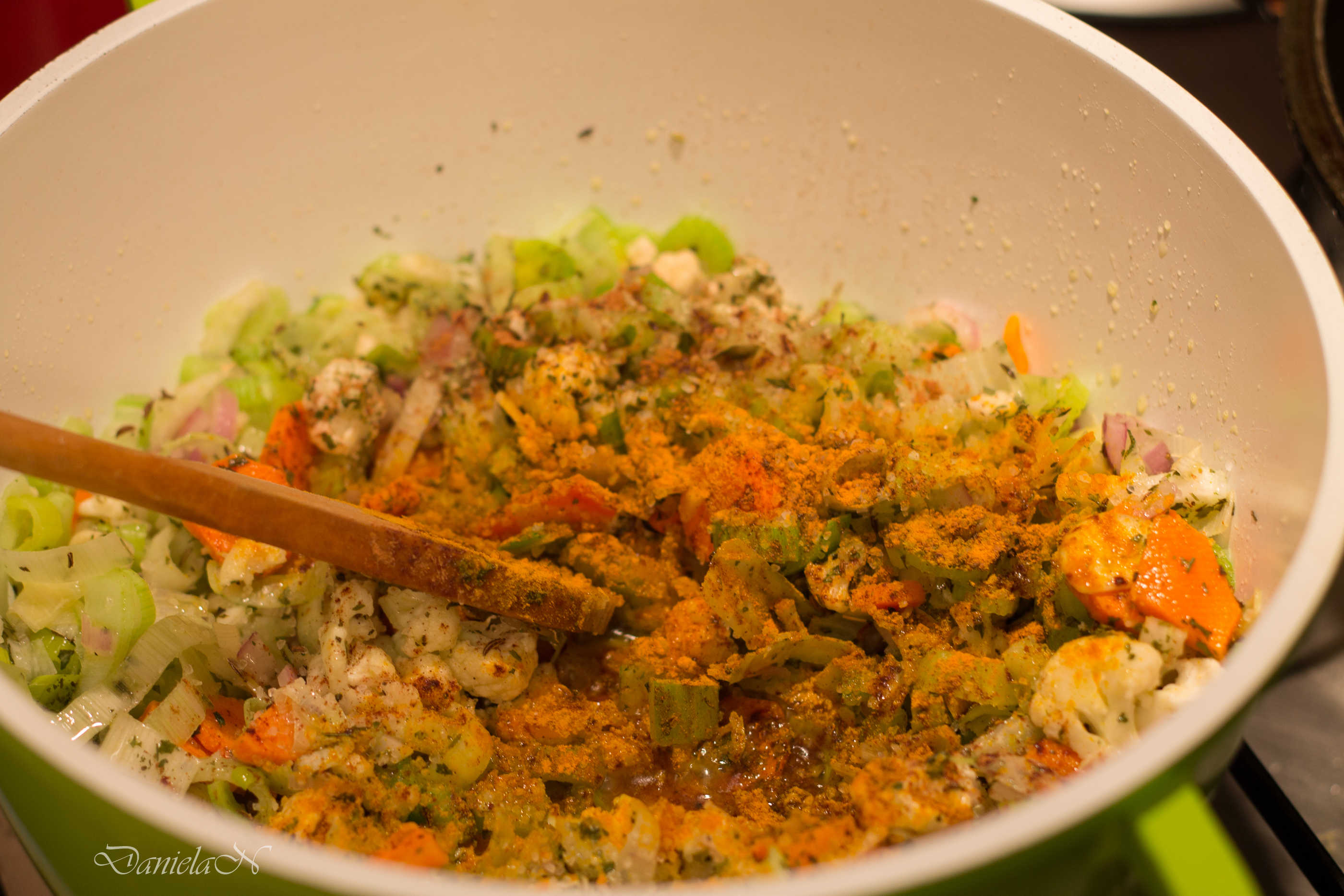 Punem uleiul de masline sa se incinga, adaugam toate legumele de mai sus si conopida maruntita, lasam focul mai domol sa nu le rumenim, adaugam condimentele si lasam asa sa palpaie pentru aproximativ 10-15 minute, avand grija din cand in cand sa mai trecem cu lingura prin oala.