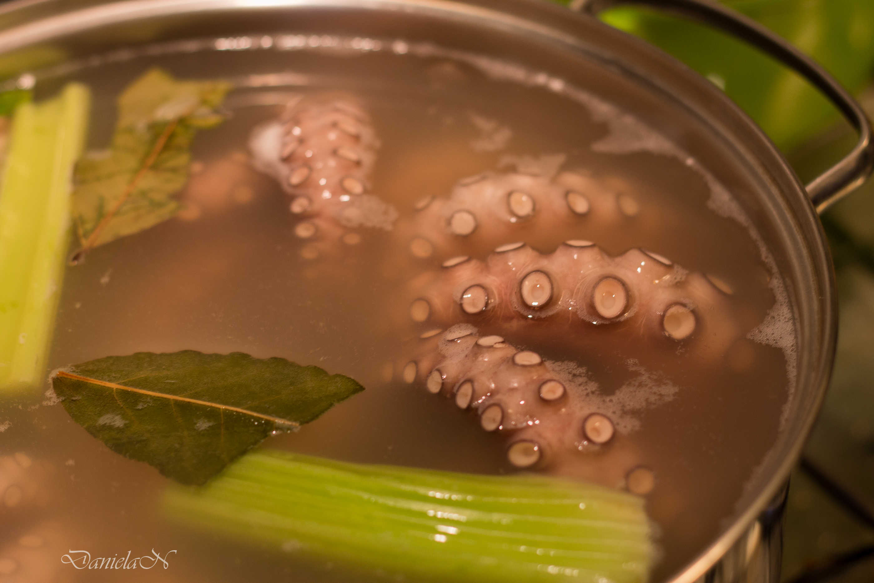 Vai, chiar trebuia sa scriu aceste detalii? Hai, sa trecem peste aspect :), avem caracatita curatata si spalata bine? Perfect pentru ca acum ne apucam de gatit.