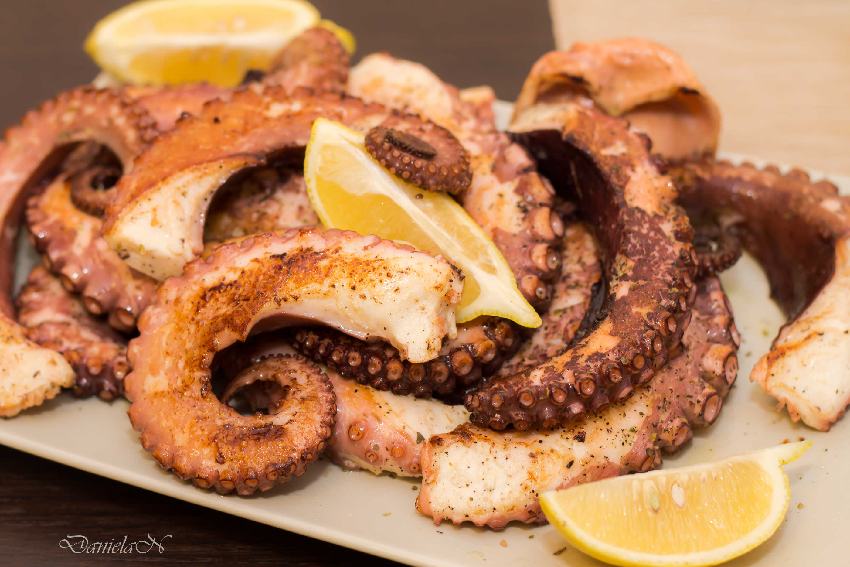 Intr-o tigaie cu un strop de ulei de masline se gatesc tentaculele la foc iute, cate 2 minute pe fiecare parte.