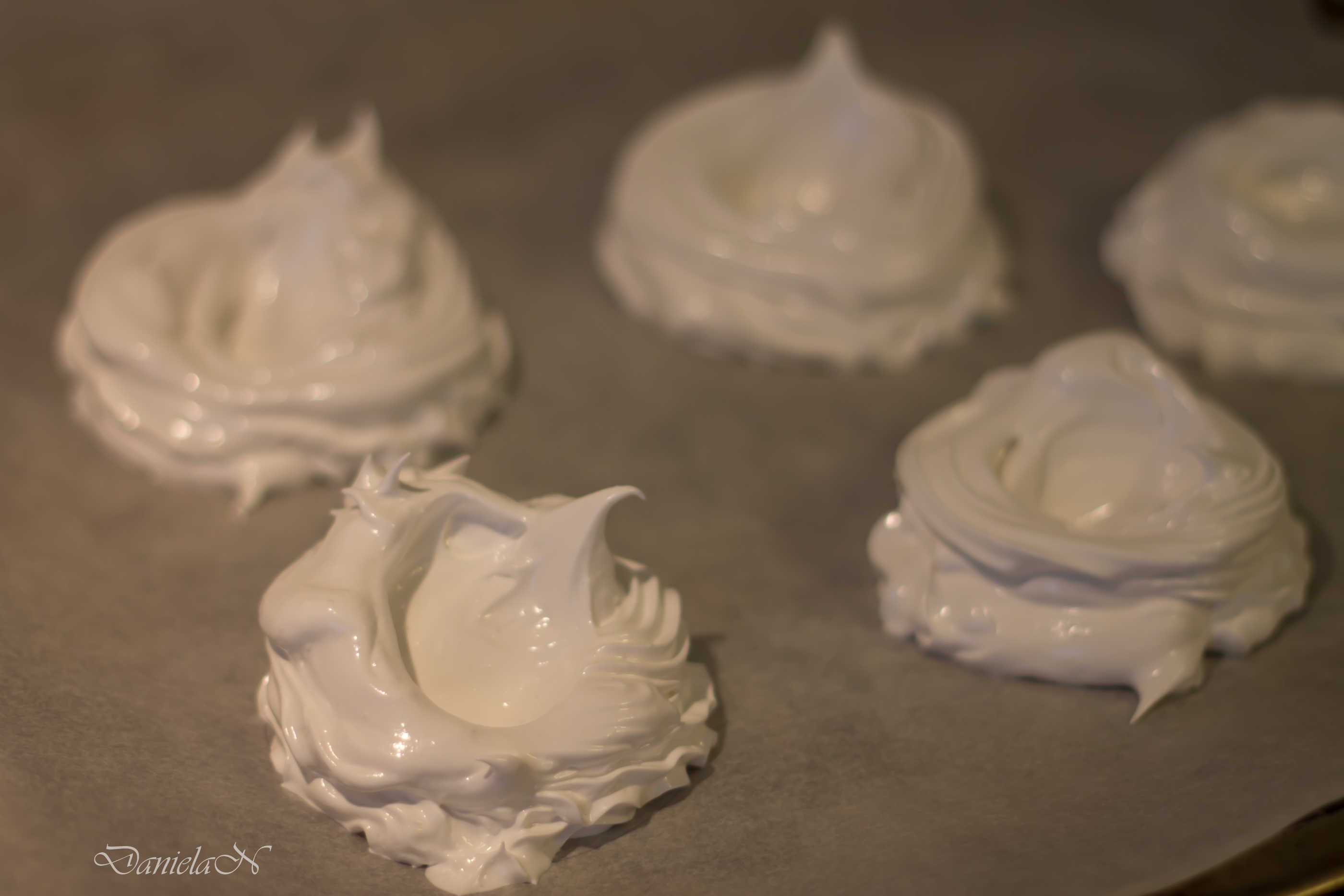 Dupa ce montam bezeaua in toate cercurile, cu o lingurita facem o mica adancitura in centrul abezelelor, pentru ca la final sa umplem golul cu o crema de mascarpone.