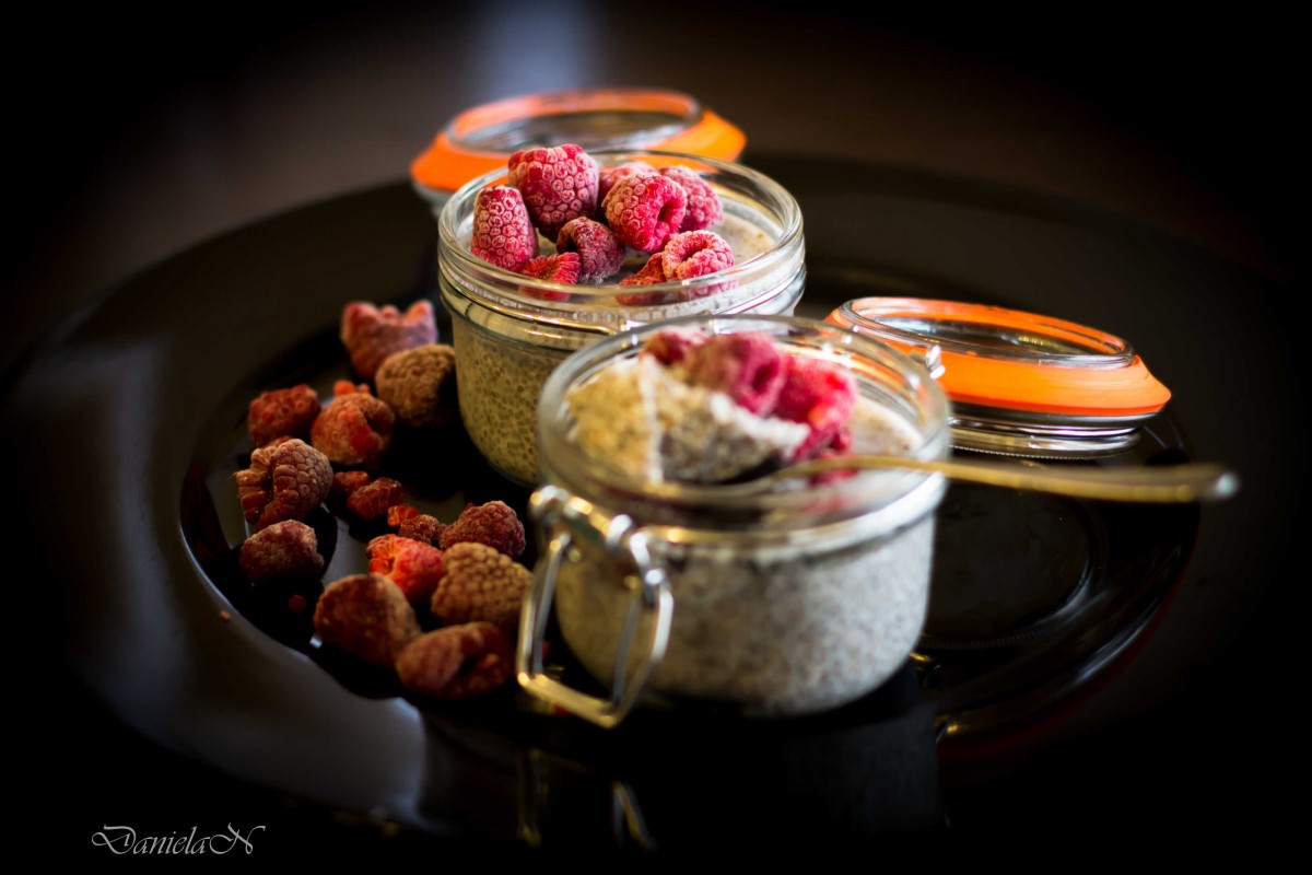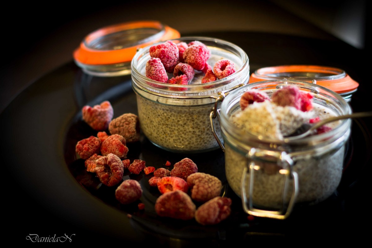 Pentru aceasta reteta, am folosit o combinatie din lapte de cocos, seminte de chia si fructe congelate, mai bio decat bio, puse frumos in pungute de catre a mea mama. 🙂