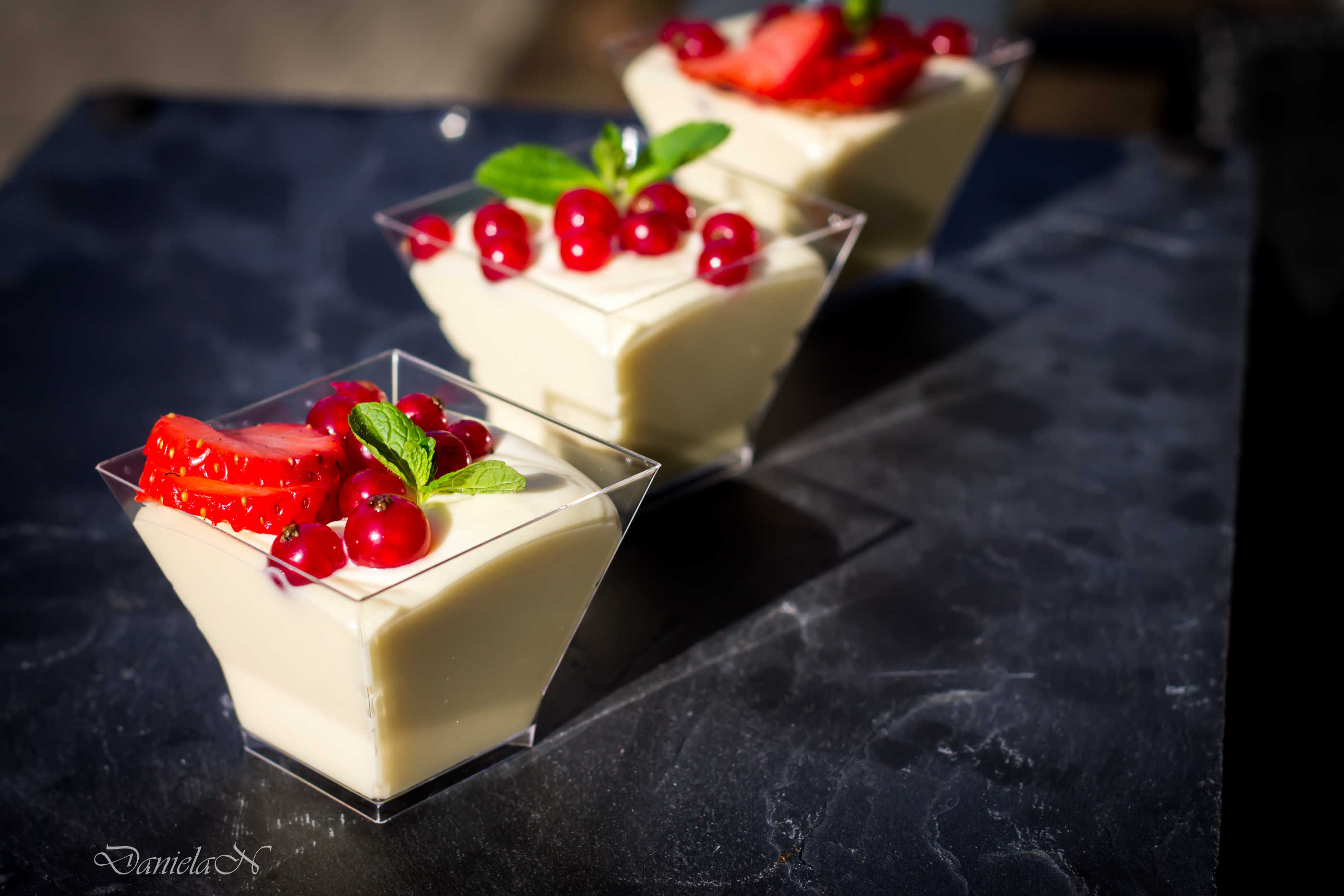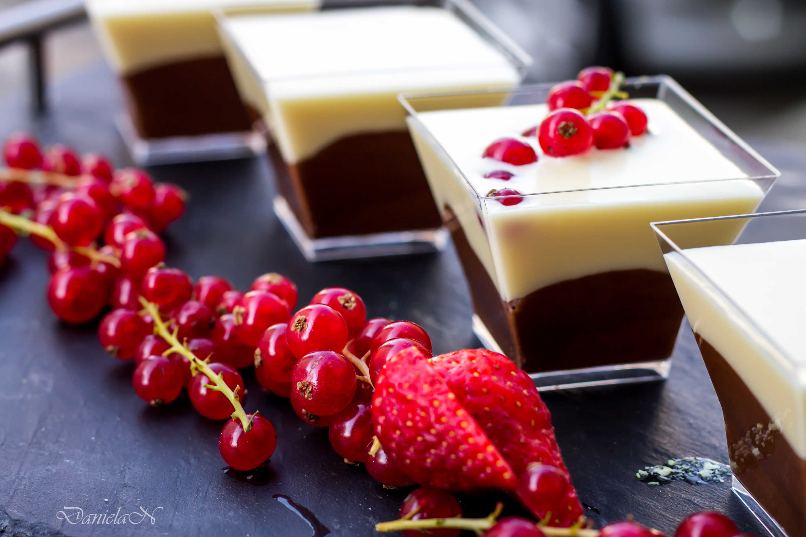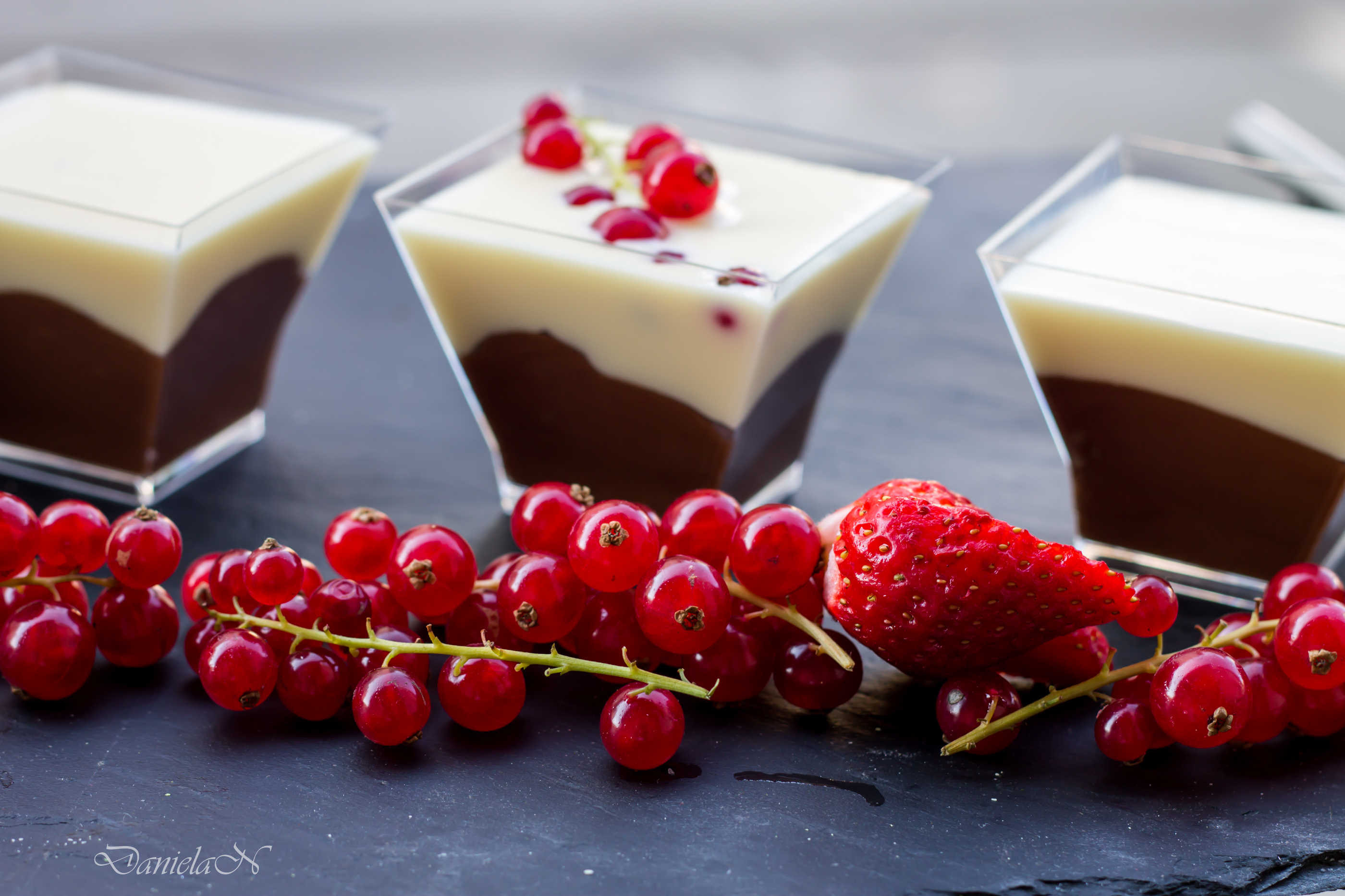 Pornind de la reteta de baza, pentru cateva pahare, am dublat cantitatea si am mers pe o combinatie in straturi de ciocolata alba cu ciocolata neagra, iar pentru a echilibra balanta, am ales un topping din fructe proaspete, usor acrisoare, coacaze rosii.