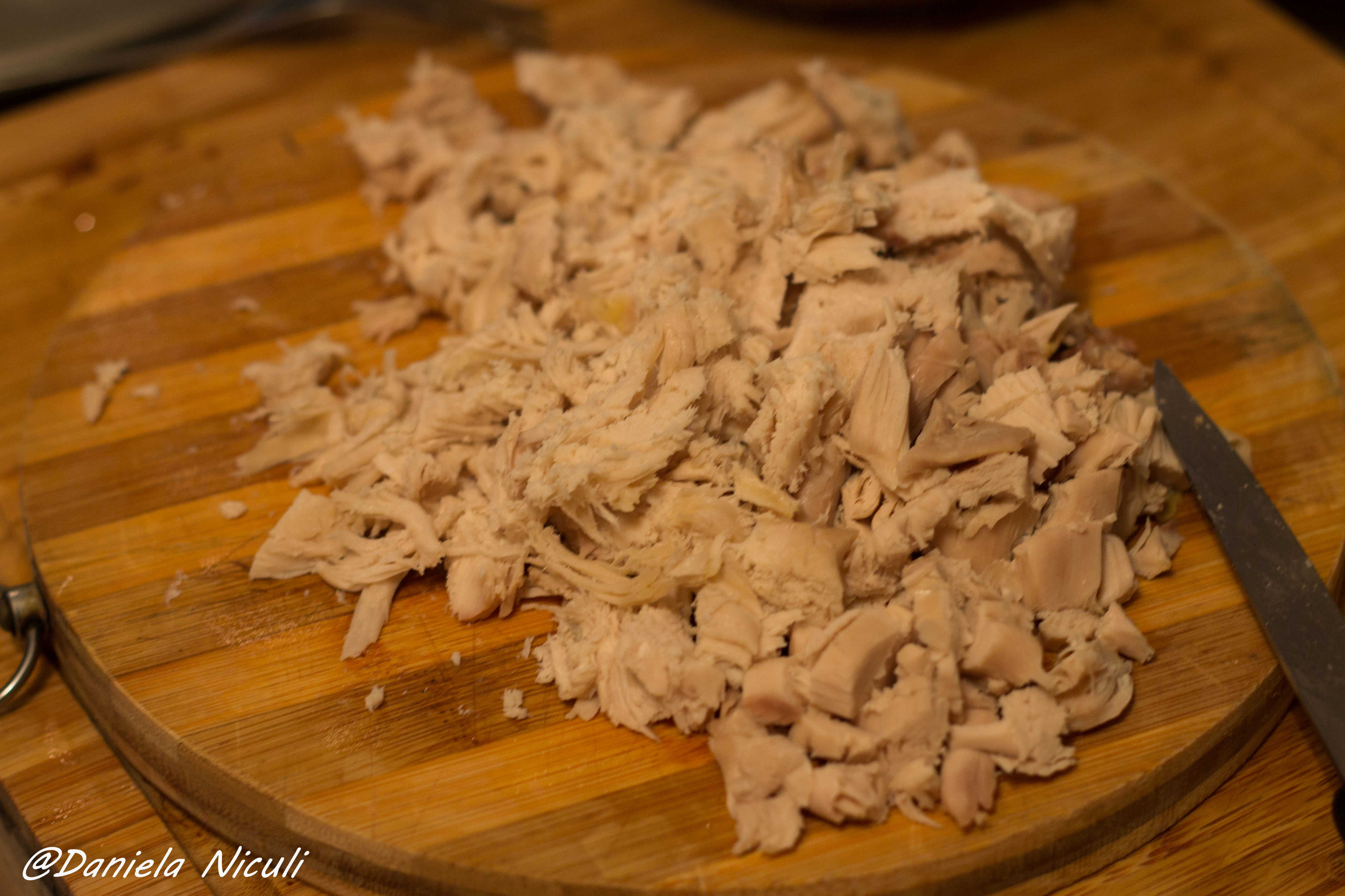 Verificam carnea, o scoatem pe un tocator, o lasam sa se racoreasca cateva minute, apoi ne apucam sa o tocam, nu foarte marunt, in fasii subtiri.