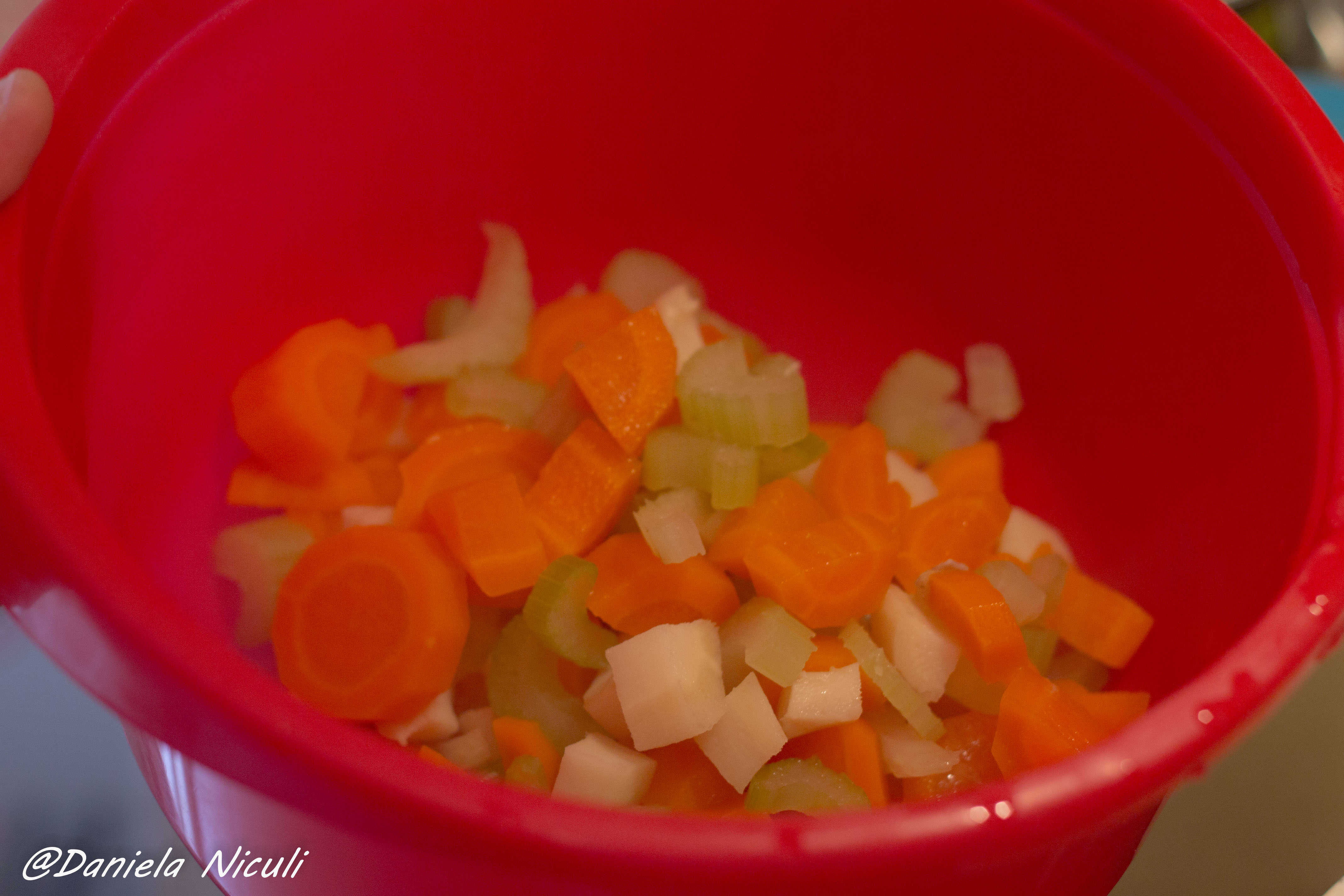 In acest timp tocam legumele, cuburi rondele, patratele, cum va este mai usor si mai distractiv, mai ales daca pregatiti aceasta supa in compania copilului care poate fi mai util decat va imaginati!