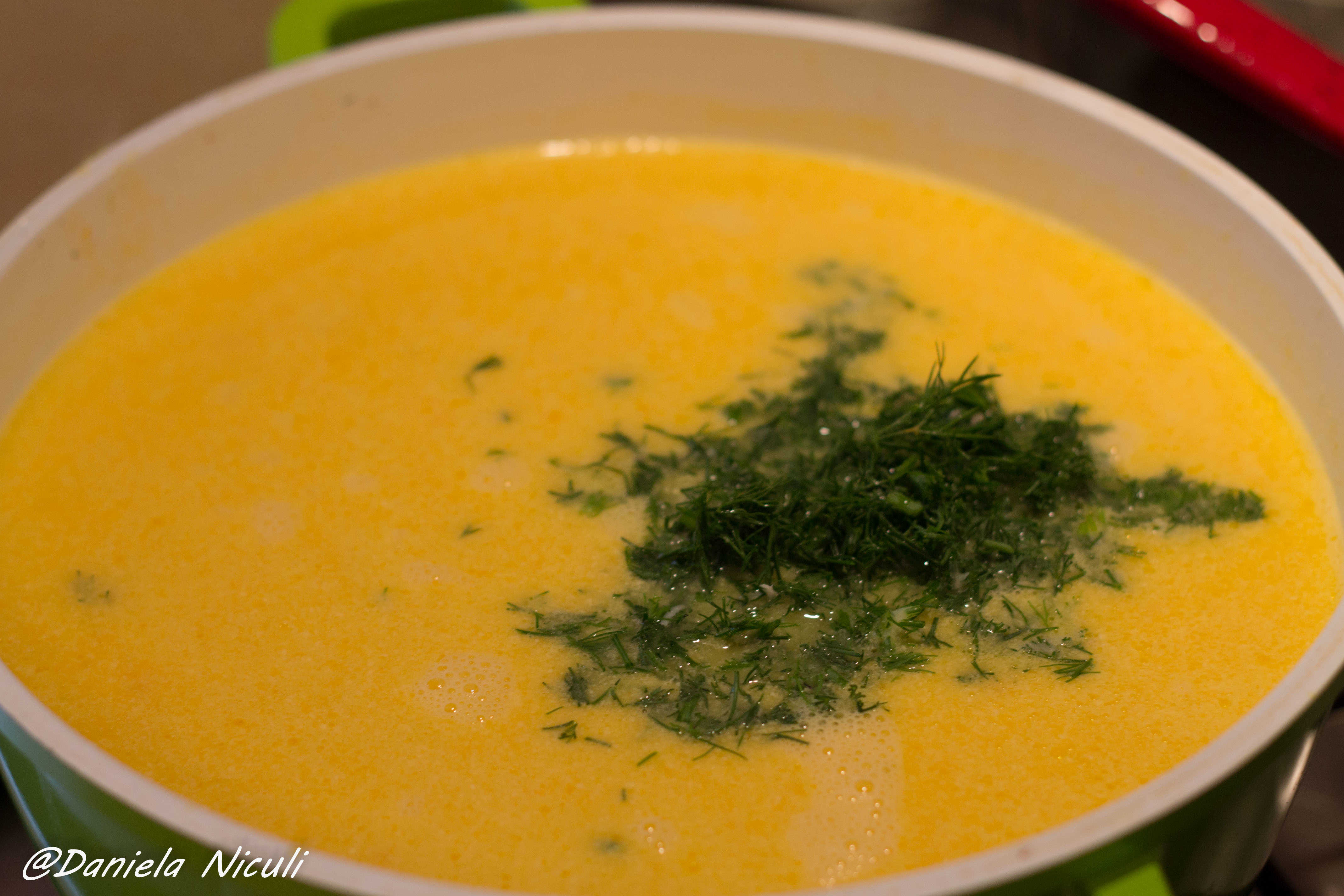 Adaugam cate un polonic de supa calda peste smantana, amestecand continuu. Continuam sa adaugam cate un polonic pana folosim cam jumatate din cantitatea de supa, apoi turnam intreg amestecul in oala, indepartand insa vasul de pe sursa de foc.