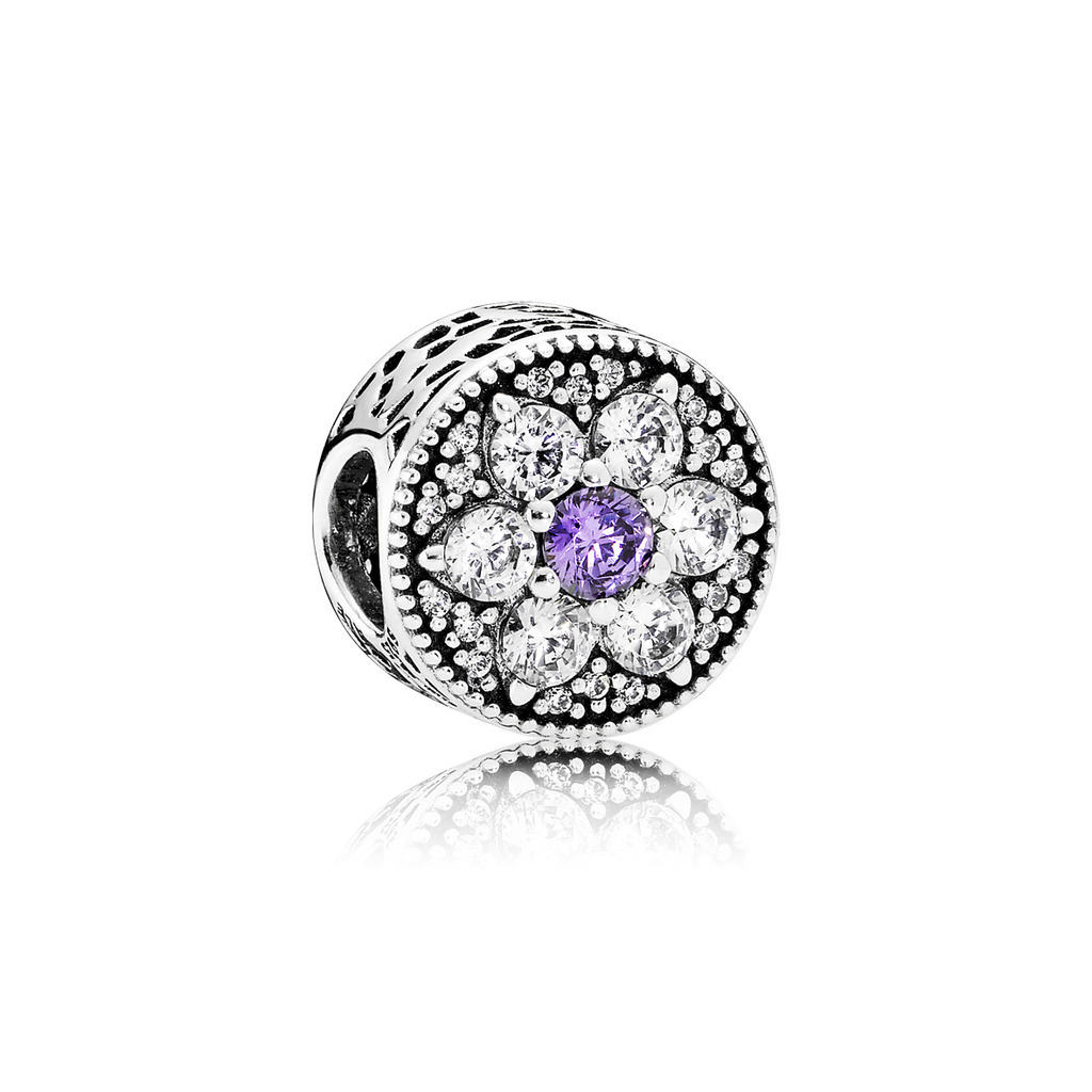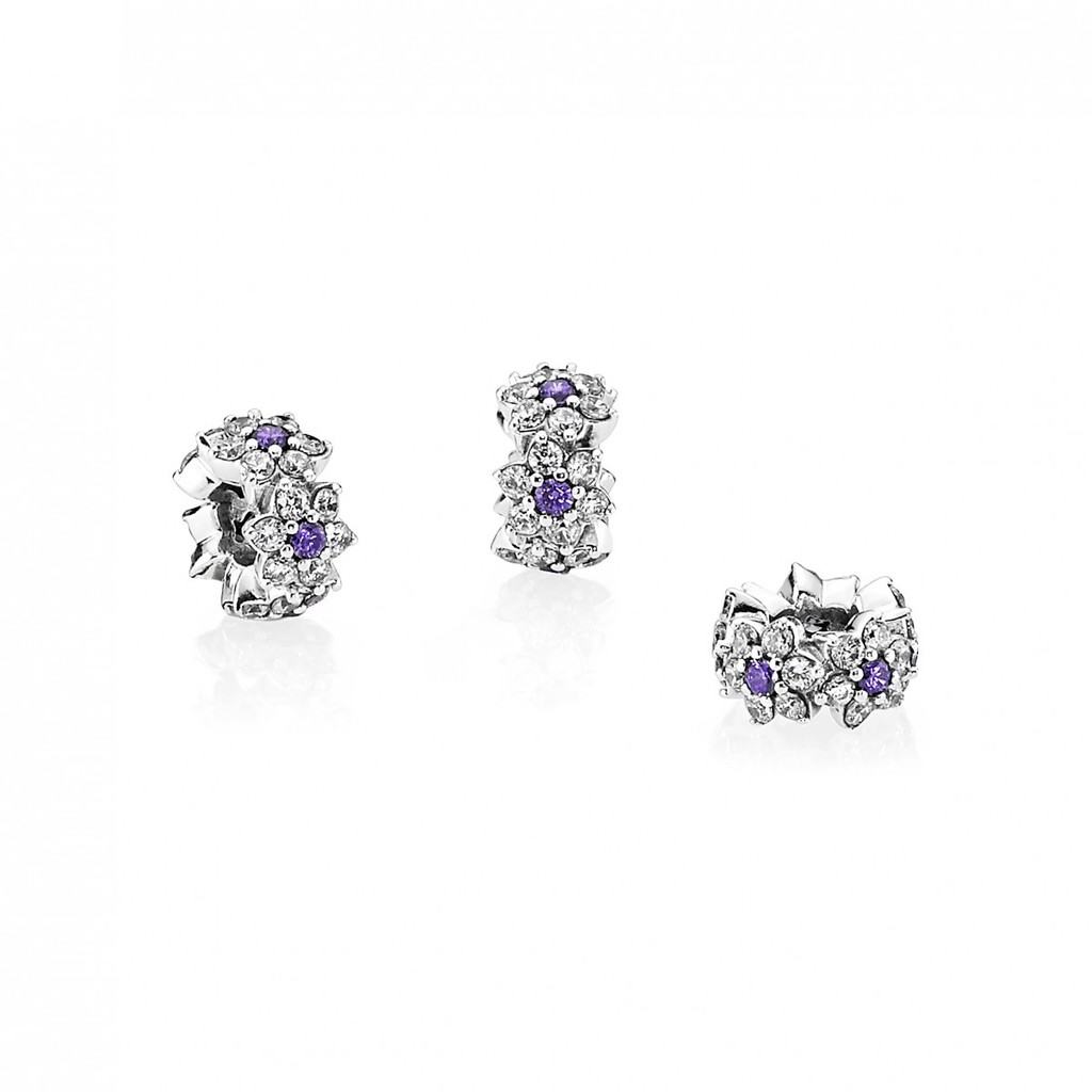 Combinând contururi îndrăznețe cu detalii delicate pe toată lățimea inelului, designul dantelat din argint 925 creează un decor elaborat de flori de Nu-Mă-Uita. Ceea ce face ca florile să prindă viață și strălucire sunt reflexiile luminoase ale pietrelor de zirconiu cubic violet, accentuate cu linii de pietricele strălucitoare din zirconiu cubic transparent.