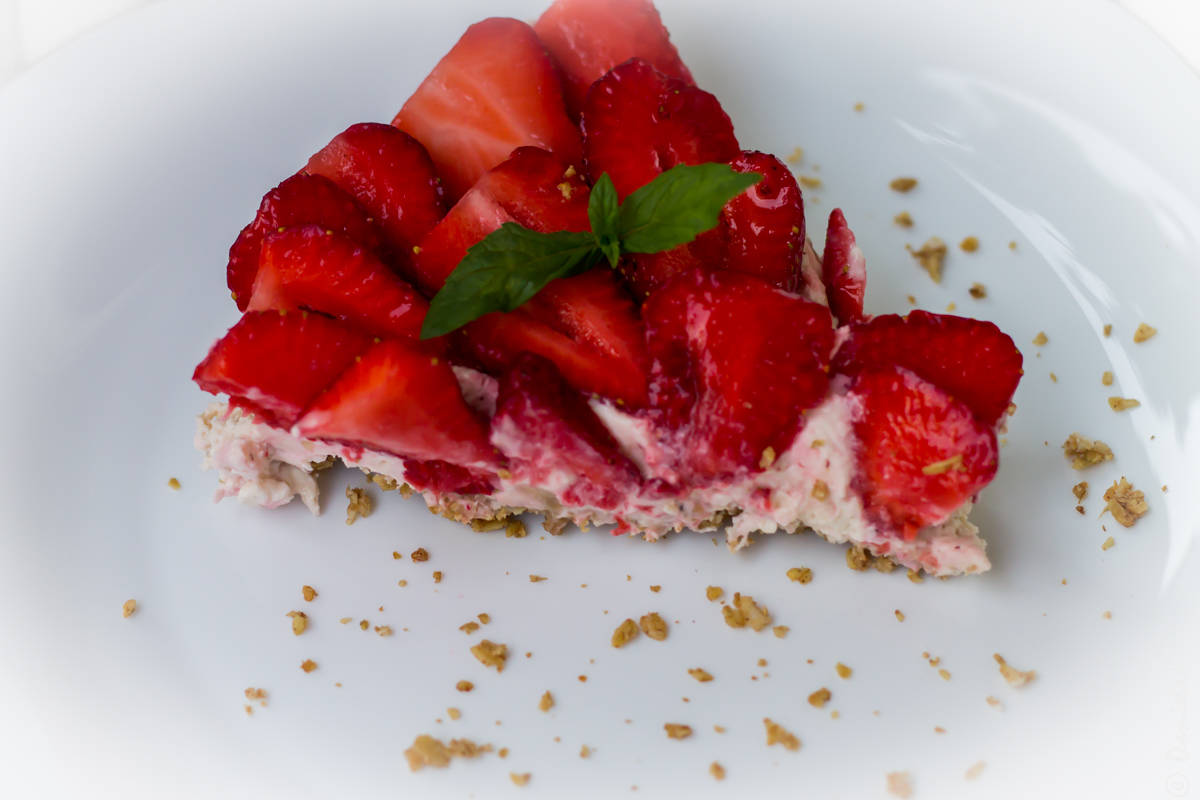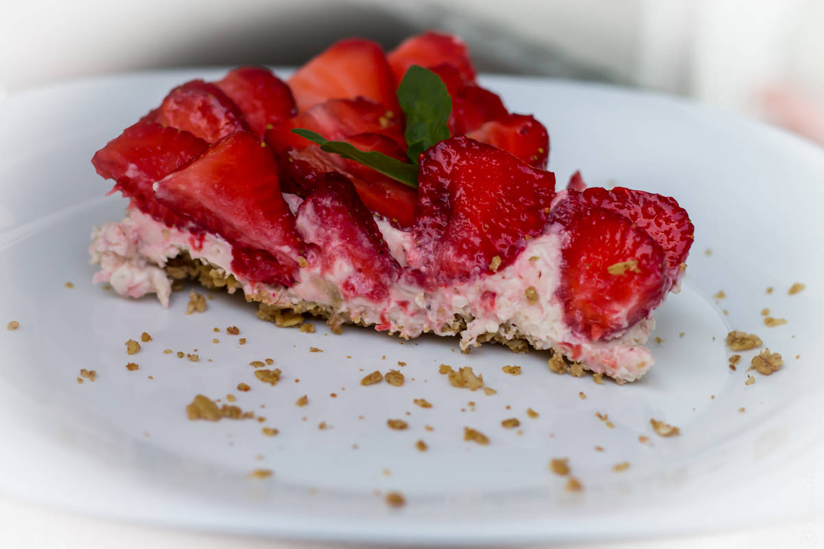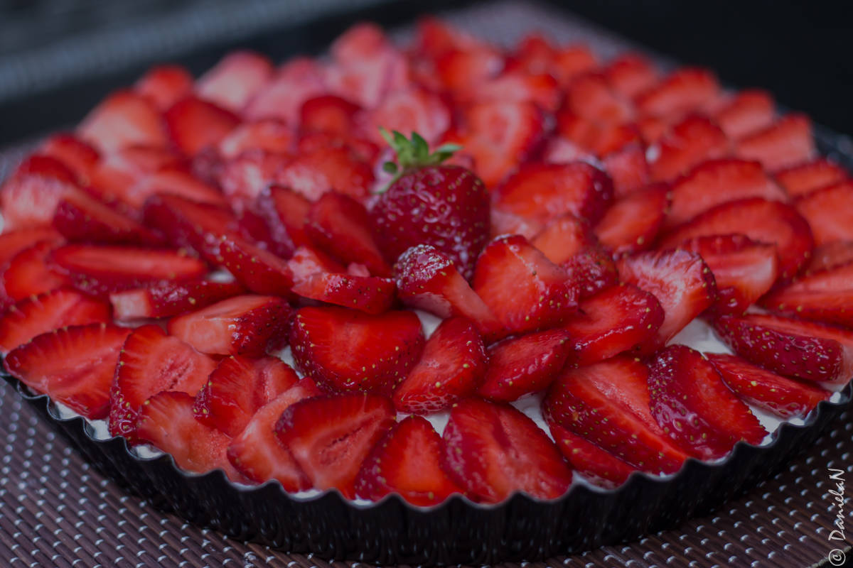 Când blatul s-a răcit complet, am adăugat umplutura și am decorat cu căpșune feliate din belșug, zău dacă știu ce cantitate, că le-am pregătit cu Alexia și mâncam în egală măsură, mai spălam altele, ami mâncam și tot așa.