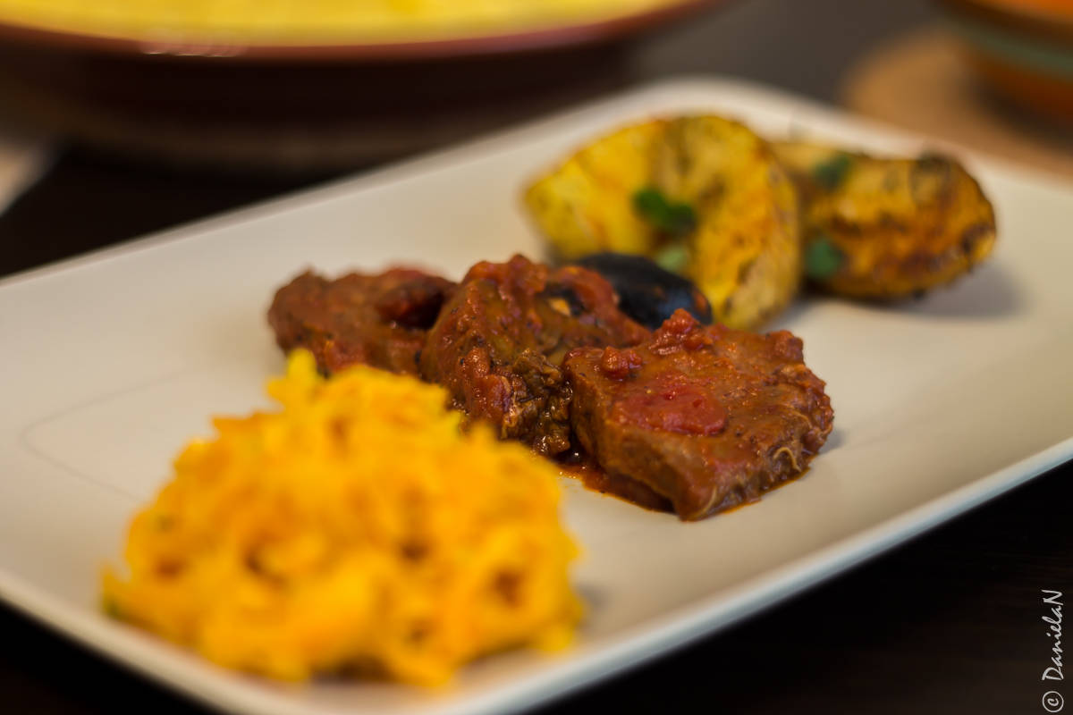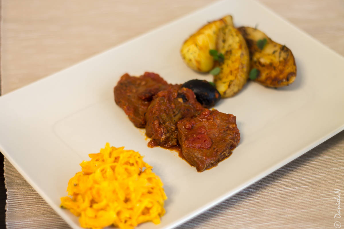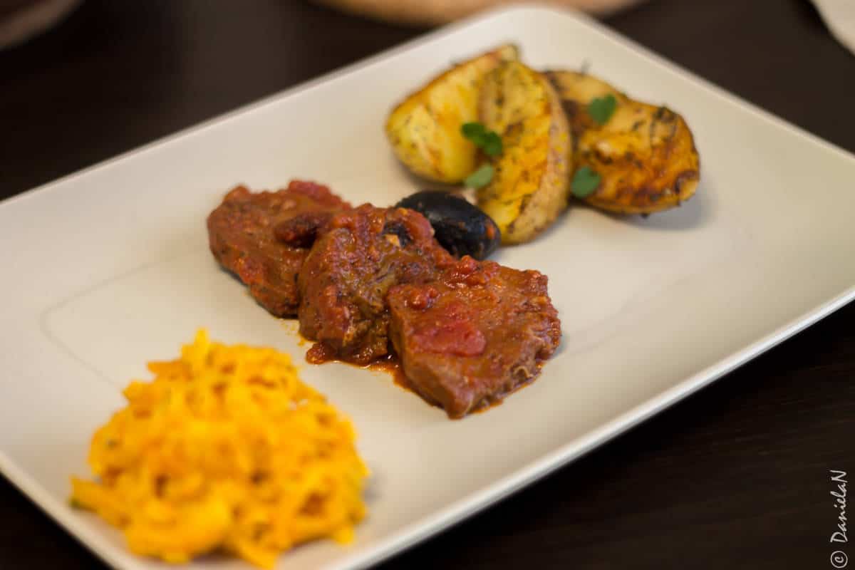Am servit cu cartofi noi la cuptor, ușor picanți pentru că am scăpat intenționat la boia. Alături am mai avut o salată de morcovi turcească: