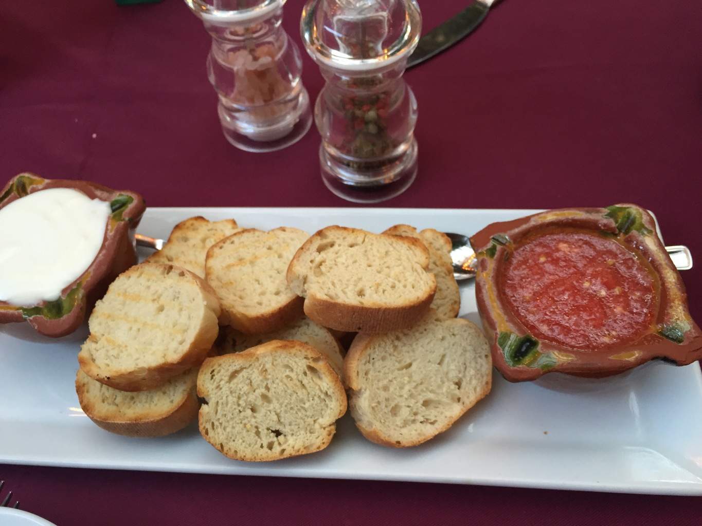 Nu am știut însă că sunt și mici gustări din partea casei, precum un sos Alioli ( maioneză cu usturoi) și un sos de roșii cu usturoi, ambele servite cu pâine prăjite. Poc, s-a dus liniștea interioară și am căzut pradă tentației.