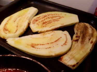 Între timp, feliile de vinete se gătesc într-o tigaie de tip grill sau o tavă mai mică (în cazul meu), Unse cu ulei pe ambele părți se lasă atât cât să își modifice culoarea.