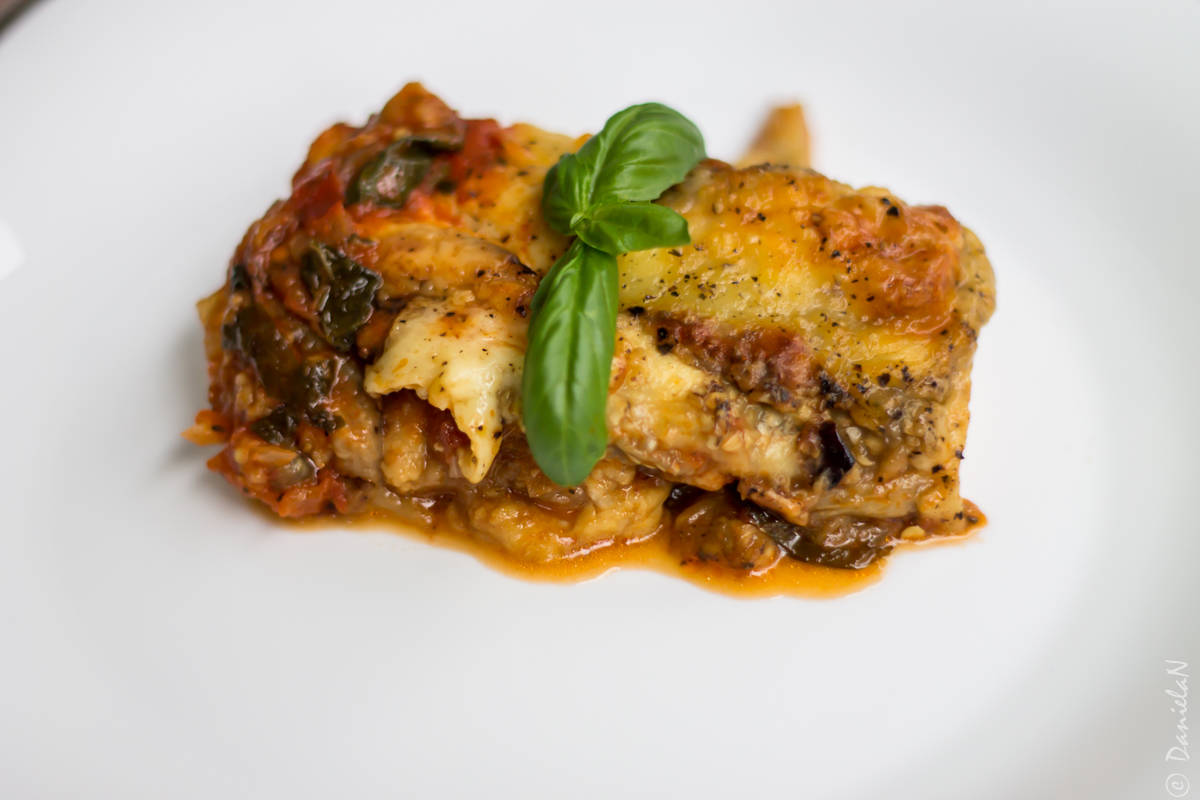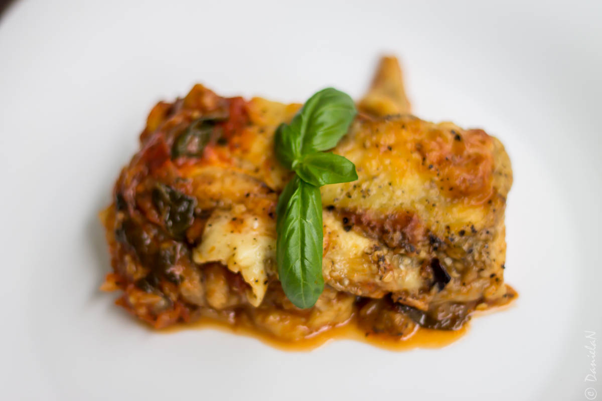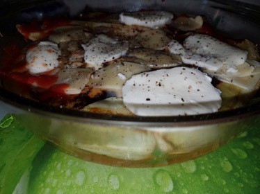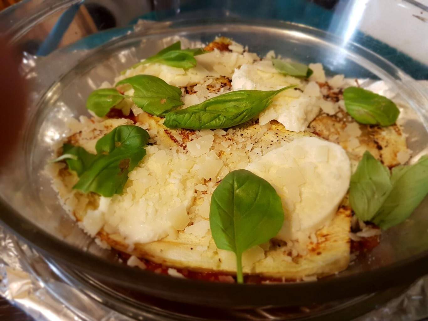 Primul strat este sos de roșii, urmat de vinete, sare și piper, parmezan, mozzarella și frunze de busuioc. Repeat!