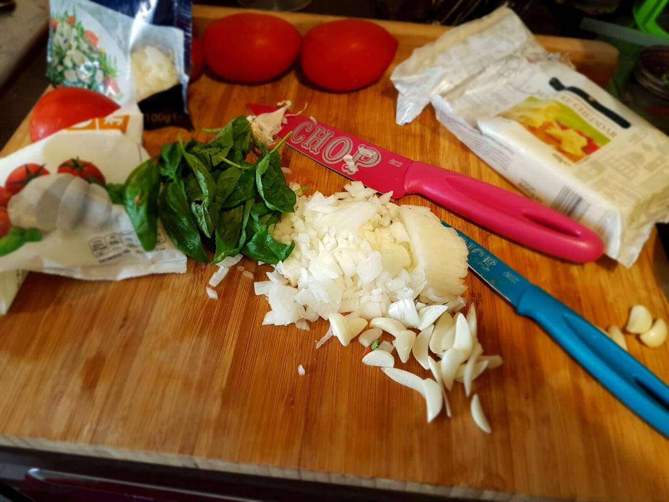 Ceapa tocată împreună cu usturoiul se călesc în două linguri de ulei de măsline, la foc mic, peste care se adaugă oregano uscat și se lasă 3-4 minute pe foc.