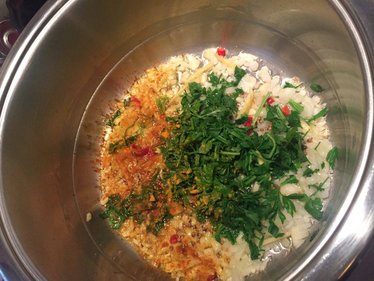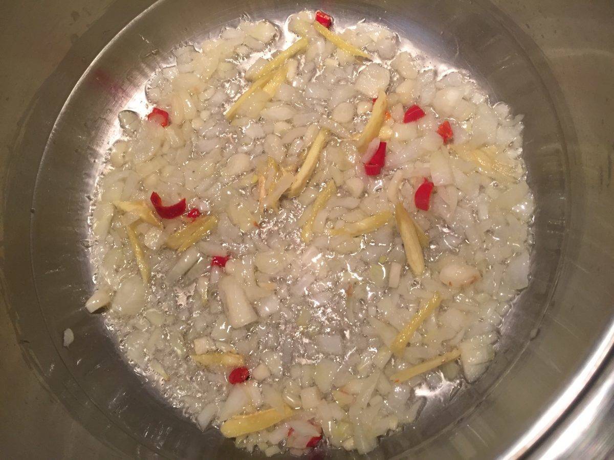 Într-un vas de mărime potrivită se adaugă uleiul de cocos, se încinge și se adaugă ghimbirul, usturoiul, ceapa tocată și ardeiul roșu mărunțit. Reduceți focul la mic, amestecați frecvent și adăugați semințele de muștar, pătrunjelul tocat și tumericul pudră.