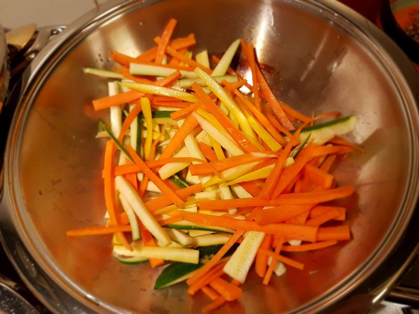 Restul legumelor, respectiv usturoi, ghimbir, zucchini și morcov, le-am tăiat bastonașe de mărime potrivită, nici foarte subțiri, nici foarte groase.