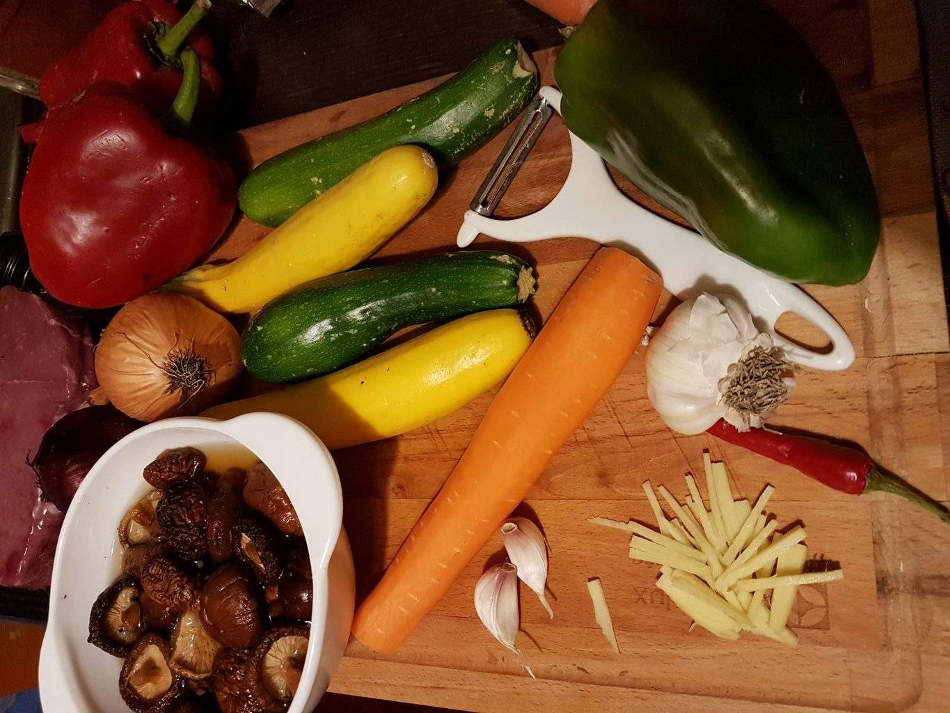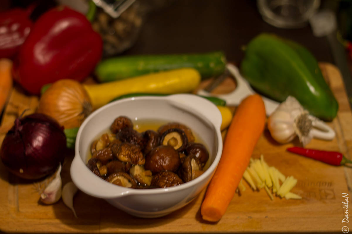 În intervalul de timp în care untul și fritptura au ajuns la temperatura camerei, am pregătit legumele pentru wok, o garnitură care mie îmi place foarte mult. Ciupercile shiitake sunt total opționale sau pot fi foarte bine înlocuite cu câteva ciuperci champignon. Întâmplarea a făcut să cumpăr mai multe pungi cu ciuperci shiitake pentru beneficiile pe care le au acestea și pentru că îmi place mâncarea asiatică.