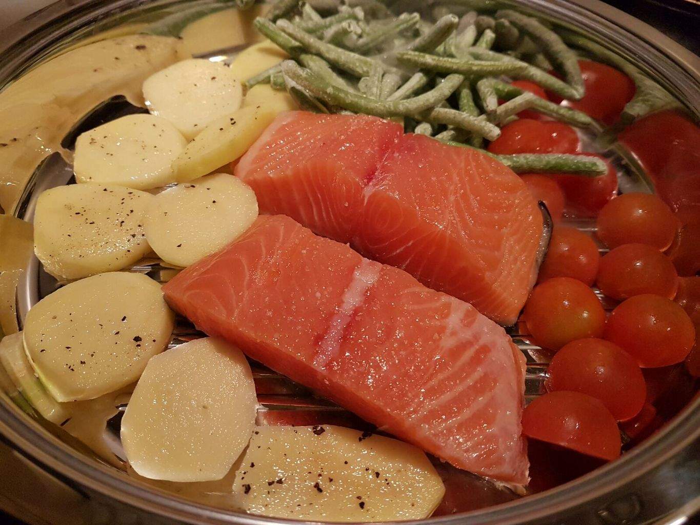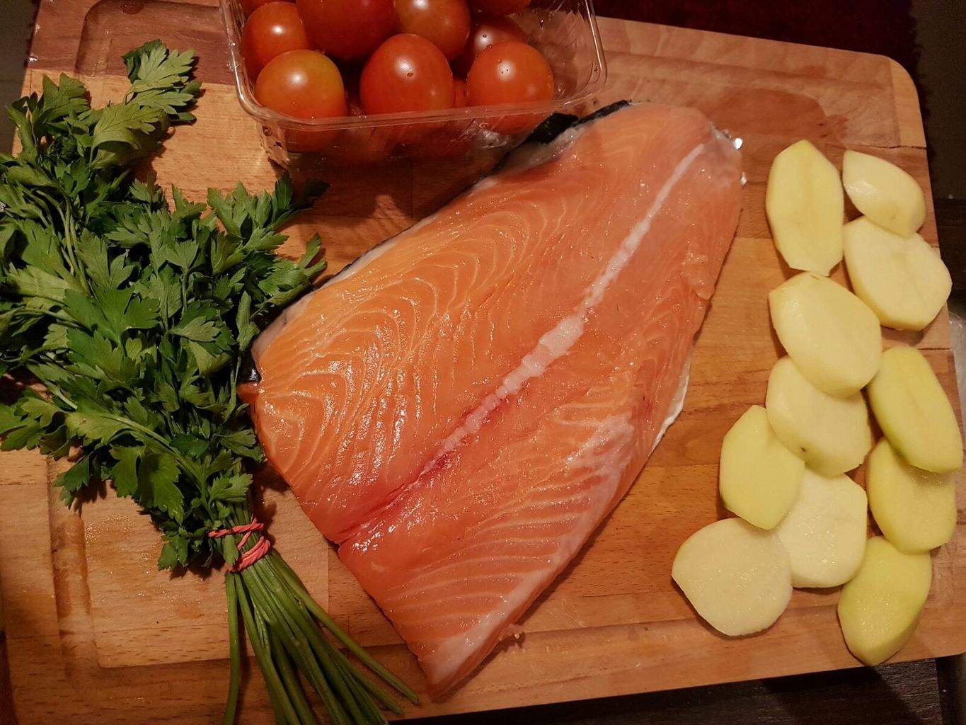 Somonul din care am scos două bucăți egale, se masează cu un strop de sare și se lasă deoparte, cartofii tăiați rondele trec prin același ritual cu sare și piper, roșiile cherry se taie pe jumătate iar pătrunjelul se toacă mărunt.