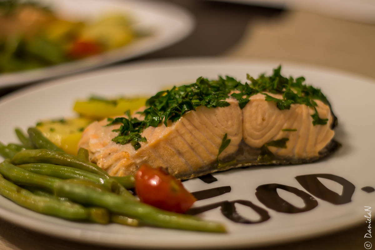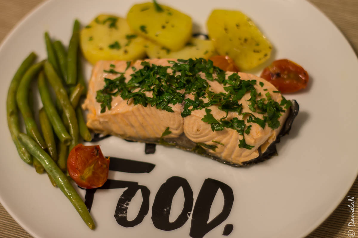 Somon cu pătrunjel, cartofi, fasole verde și roșii cherry