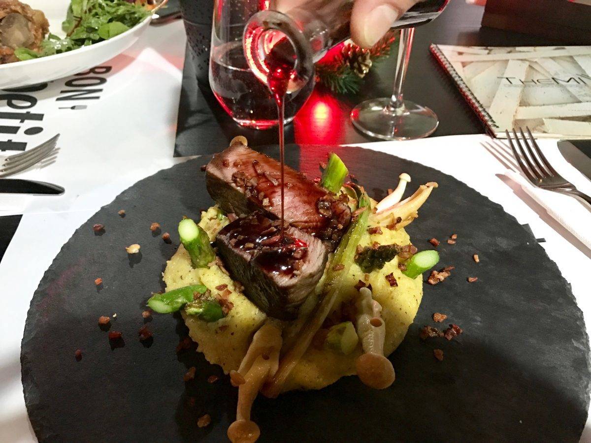 Queen Beef . Vită cu sos de vin roșu (nu e vișinată în sticla aceea, e un sos!) servită cu mămăligă și unt de trufe, sparanghel, ciupercuțe, cât se poate de lejer pentru o cină.