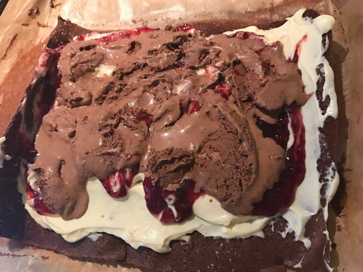 Pentru început se preîncălzește cuptorul la 180 de grade și se tapetează cu unt și hârtie de copt o tavă cu diametrul de 25cm X 38cm. Tot acum e bine să scoateți înghețata din congelator.