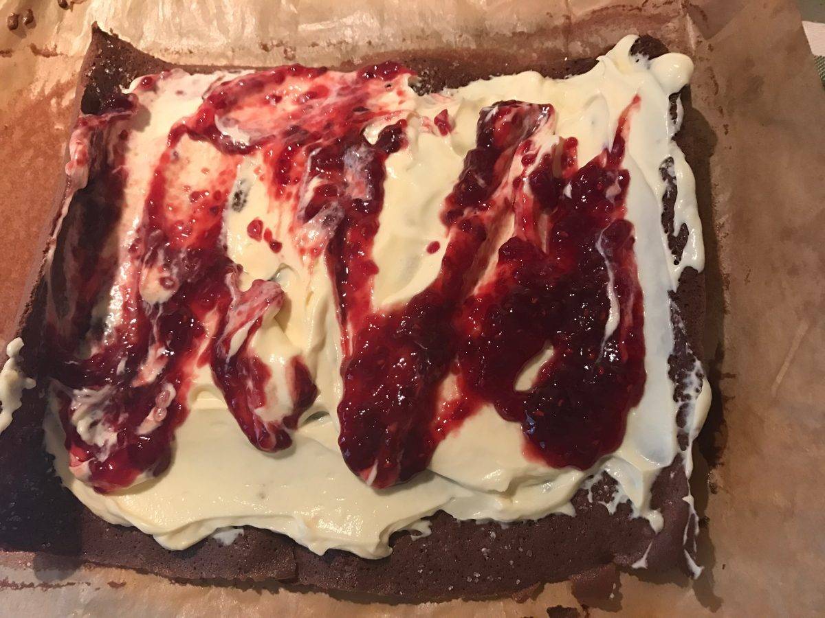 Se răstoarnă aluatul pe prosop și se îndepărtează hârtia de copt. Imediat ce hârtia a fost înlăturată, se rulează blatul strâns cu ajutorul prosopului și se lasă deoparte până când se răcește complet.