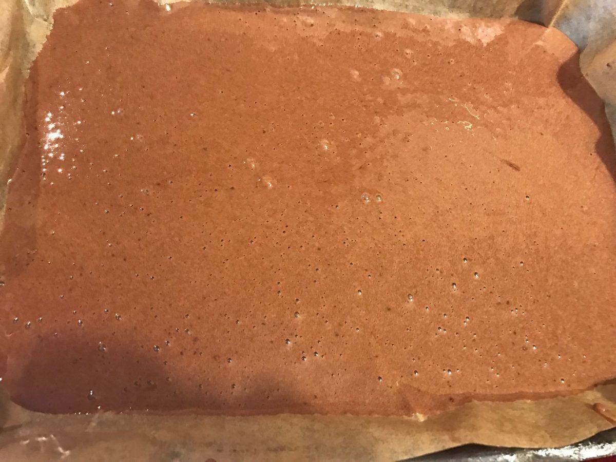 Amestecul ajunge uniform în tava pregătită cu hârtie de copt, apoi în cuptor pentru 10 minute.