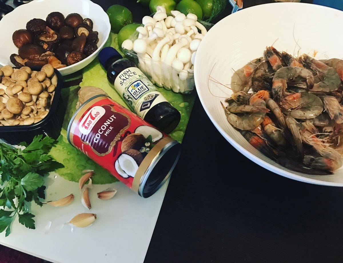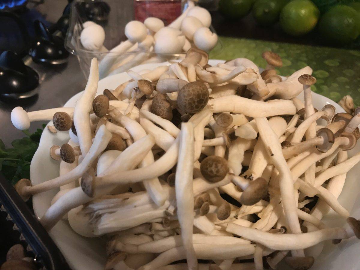 Urmărind practic culorile de pe capac știu exact care sunt următoarele etape. Acesta a fost momentul când am adăugat sosul de pește, tăițeii de orez, creveții, ciupercile shimeji și cele shiitake scurse de excesul de apă și feliate grosier.