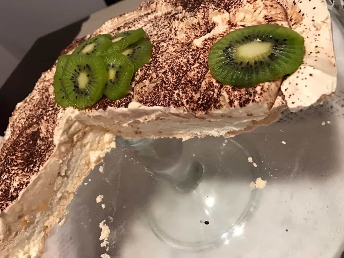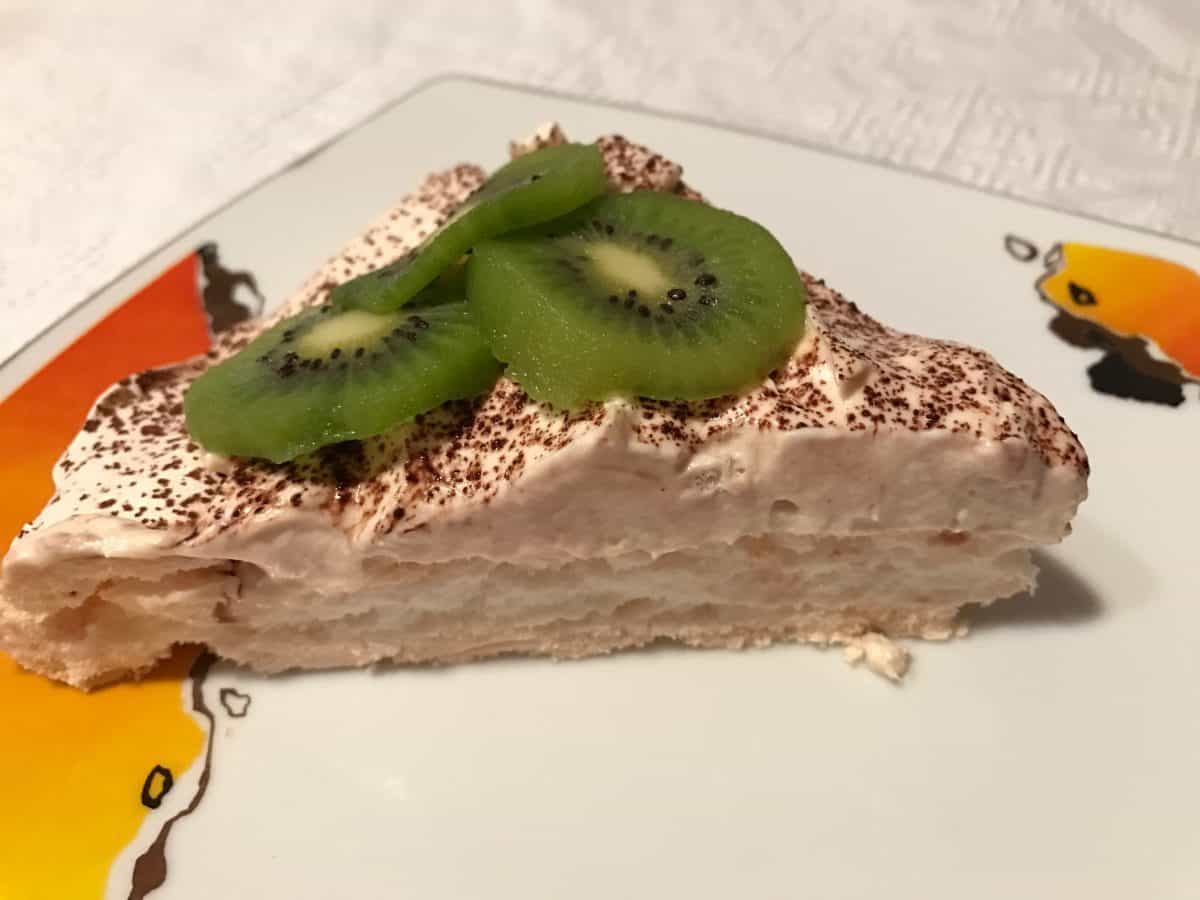 Pentru decor se pudrează cu cacao, iar fructele proaspete vor echilibra gustul. Kiwi, ușor acrișor a venit perfect în completarea bezelei care este destul de dulce, dar cu siguranță are un gust interesant dacă se renunță la fructe.