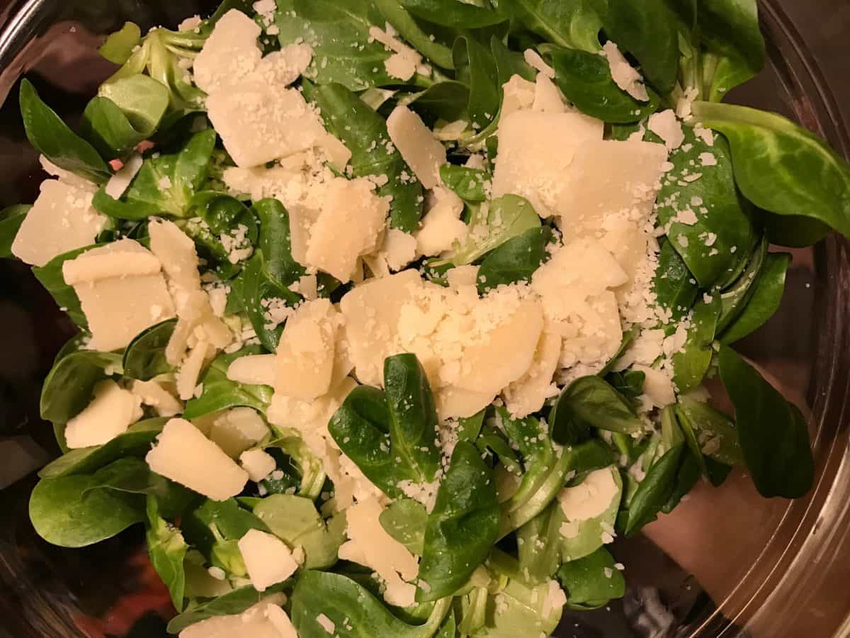 Frunzele de salată se amestecă cu bucăți de parmezan peste care se adaugă năutul bine scurs de excesul de lichid.