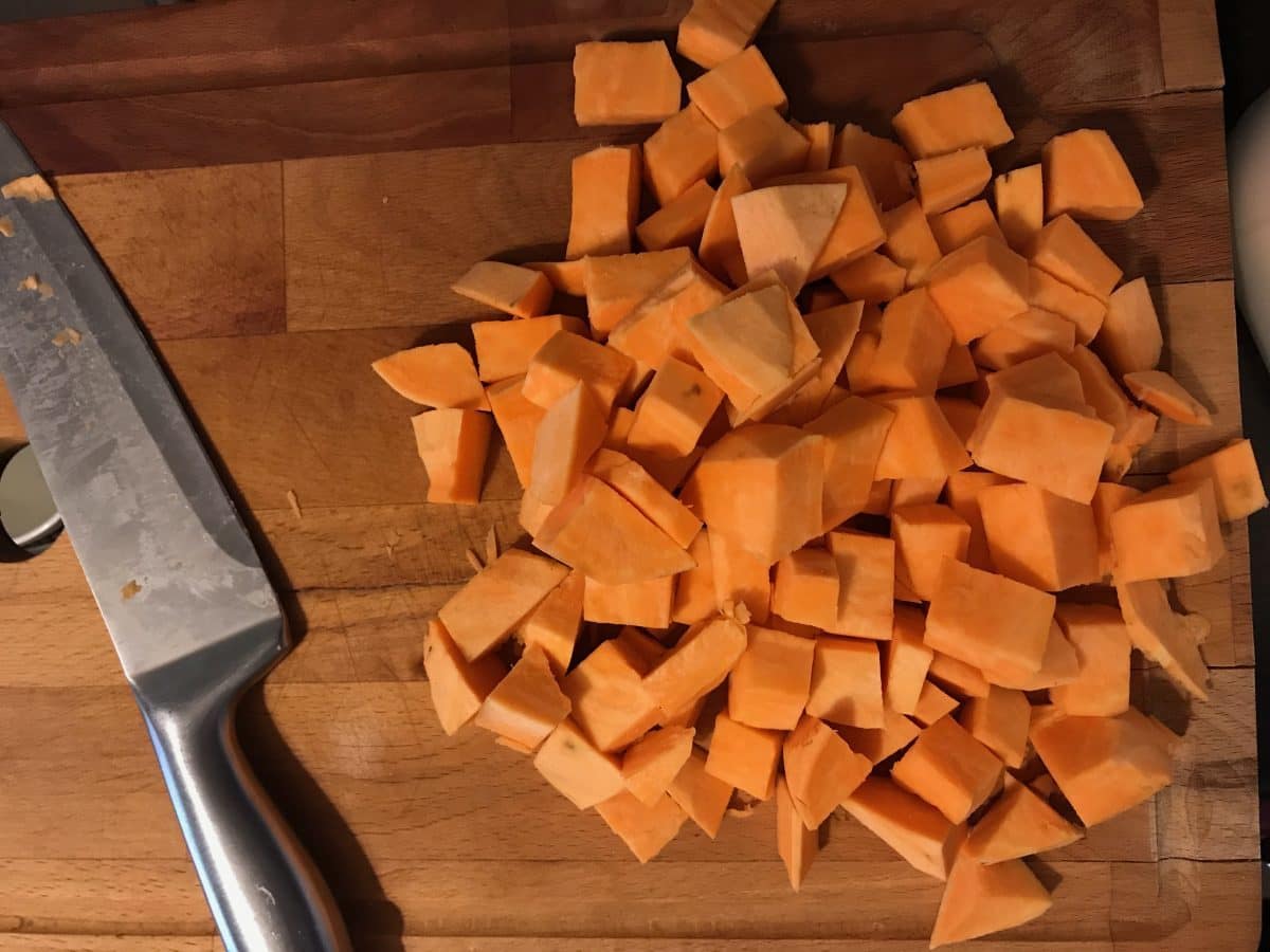 Ceapa se toacă rondele, iar cartoful dulce curățat de coajă, se taie în cuburi, timp în care spanacul se lasă la înmuiat pentru a se elimina mizeria, apoi se spală în câteva ape pentru a fi siguri că nu ronțăim ceva dubios.