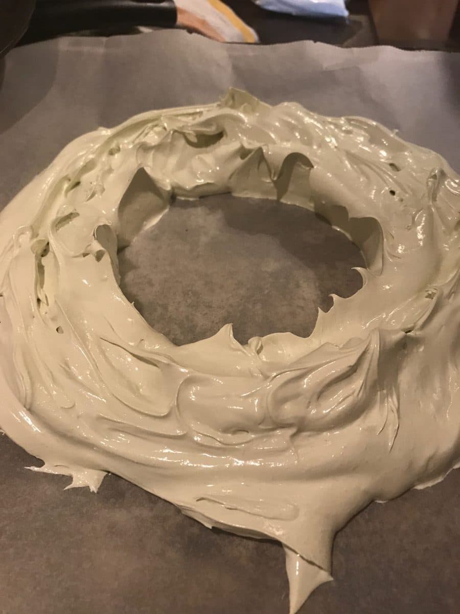 - Bezeaua obținută se încadrează în forma trasată cu creionul, în mijlocul căreia așezăm o formă rotundă pentru ca tortul nostru să arate ca o frumoasă coroniță.