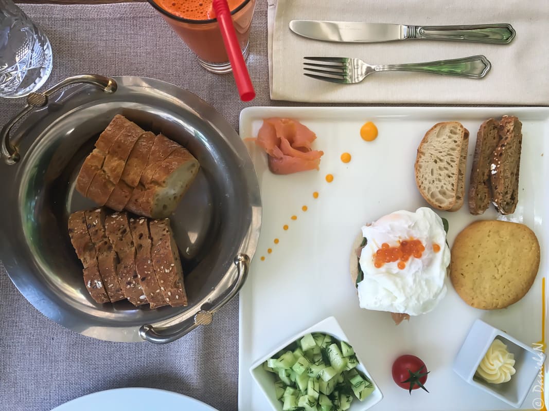 Eu zburat direct către New York și m-am delectat cu ouă benedict, salată de roșii, unt și pâine. La Alexia lucrurile sunt mai complicate, dar a început cu un suc natural de morcov și portocală, lângă care au mai poposit două sortimente de dulceață și pâine prăjită.